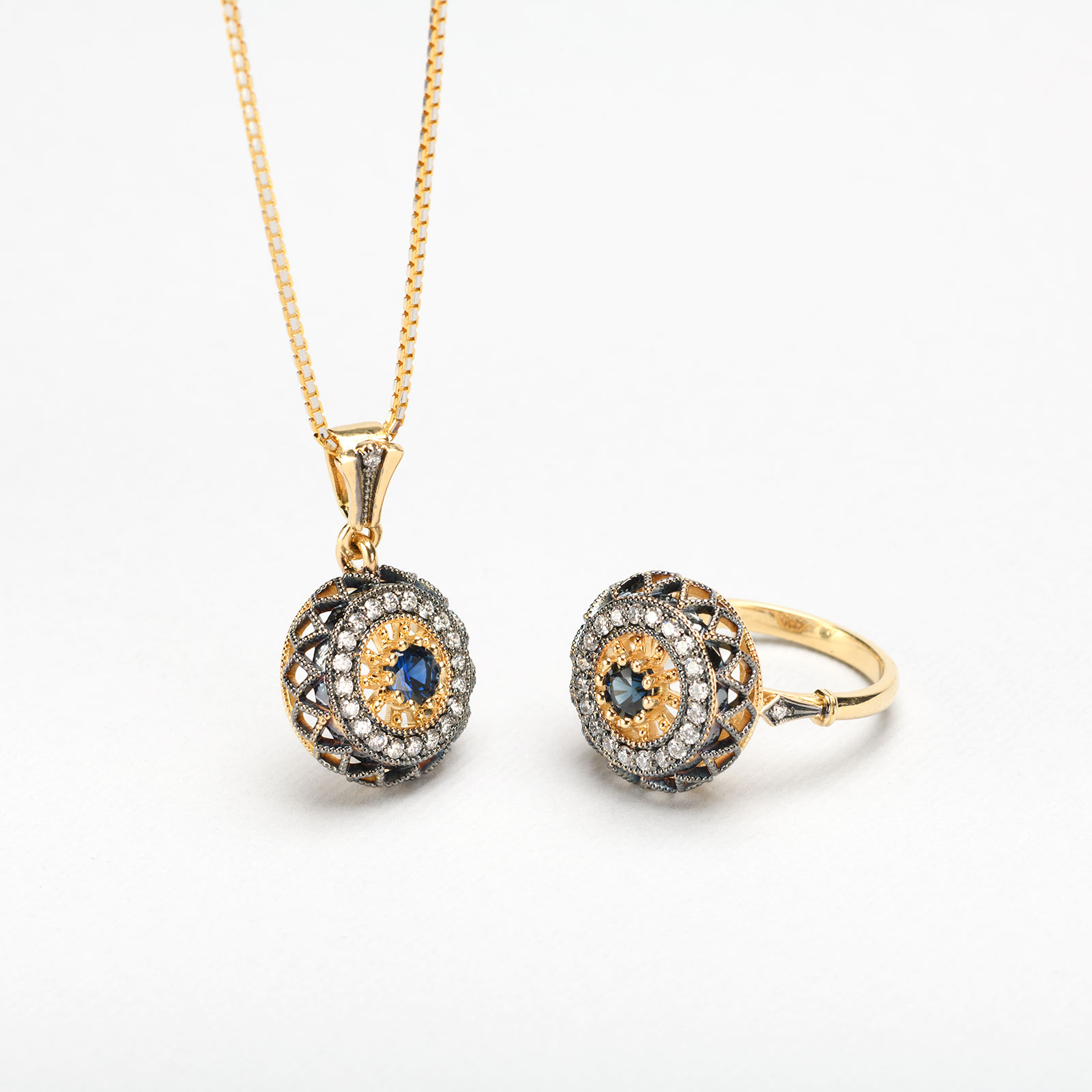 Ażurowy, przestrzenny i delikatny jak mgiełka, rozkoszny jak szafirowo-brylantowa poezja, ozdobi i oczaruje swoim wdziękiem każdą kobietę. Złoty naszyjnik z szafirem i brylantami, mistrzowsko wykonany przez najlepszych, krakowskich jubilerów. W tym pięknym, misternym wisiorku oprawiono w sumie 21 sztuk brylantów G/VS o łącznej masie ok. 0,25ct oraz szafir o średnicy ok. 4,0mm o pięknej, niebieskiej barwie. Do kompletu złoty łańcuszek o długości 40cm Waga: ok. 5,00g, materiał: złoto 585 (14k). Można zestawić w komplet z kolczykami i pierścionkiem BLUE MIST.