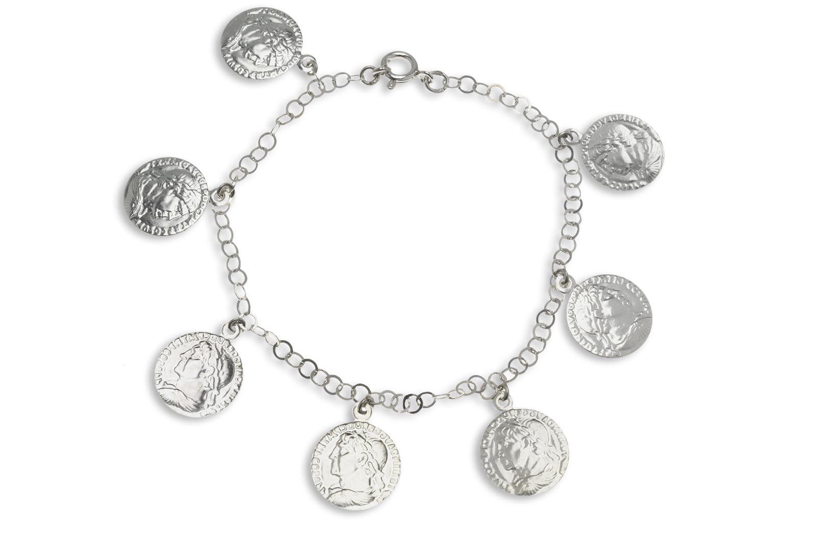 Bransoletka ma splot typu ankier i umieszczone są na niej monetki o średnicy ok. 1,5 cm, jest ona regulowana - będzie pasowała na każdy nadgarstek.