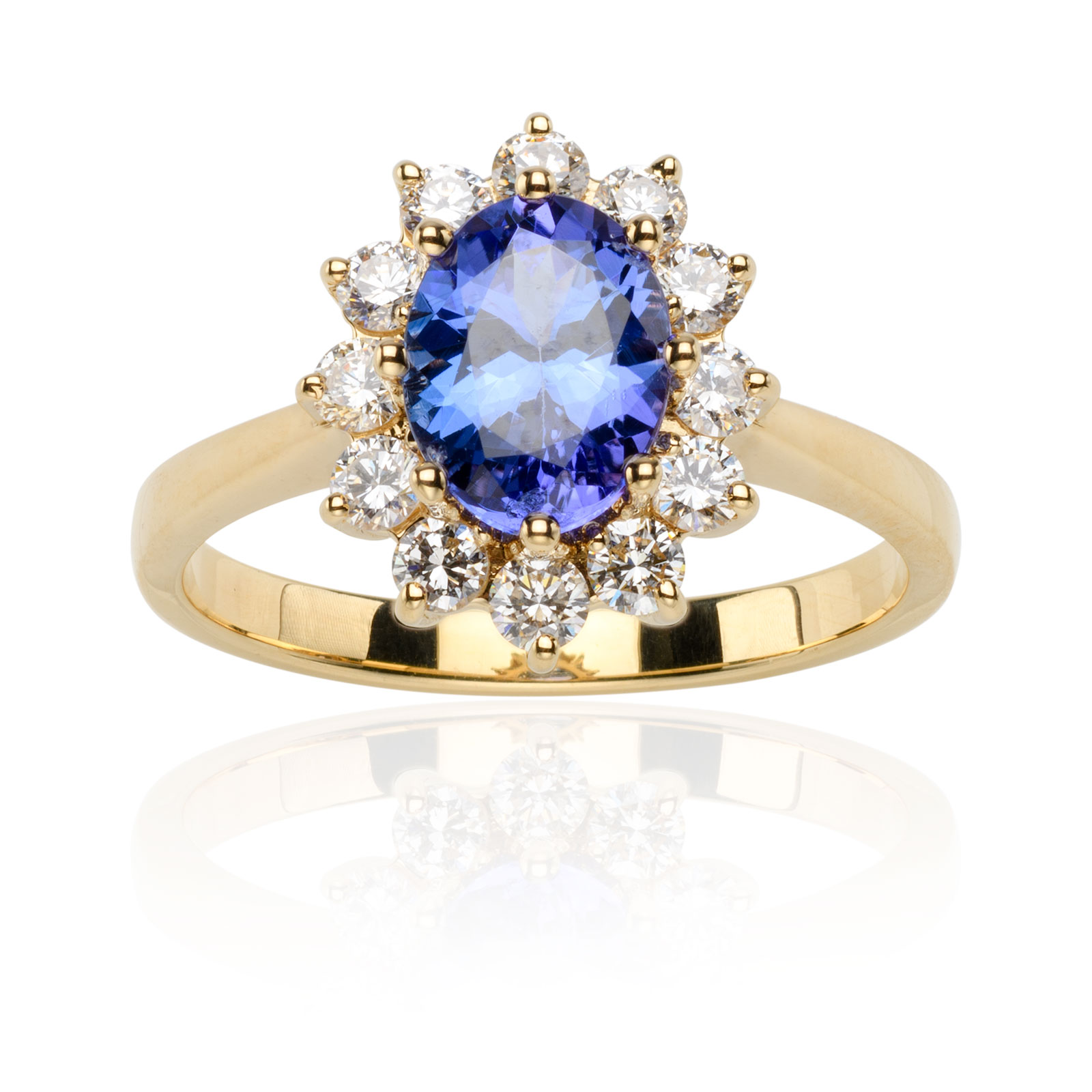 Brigitte - niesamowity pierścionek wykonany z żółtego złota próby 585. Na środku umieszczony jest egzotyczny tanzanit o wymiarach 8 x 6 mm, a rozświetlają go brylanty w ilości 12 sztuk o łącznej masie 0,50 ct. barwa G, czystość VS. To oryginalna propozycja na specjalne okazje: zaręczyny, rocznice lub urodziny. Nasze pierścionki są wykonywane przez Polskich jubilerów, od podstaw, ręcznie z niezwykłą precyzyjnością.