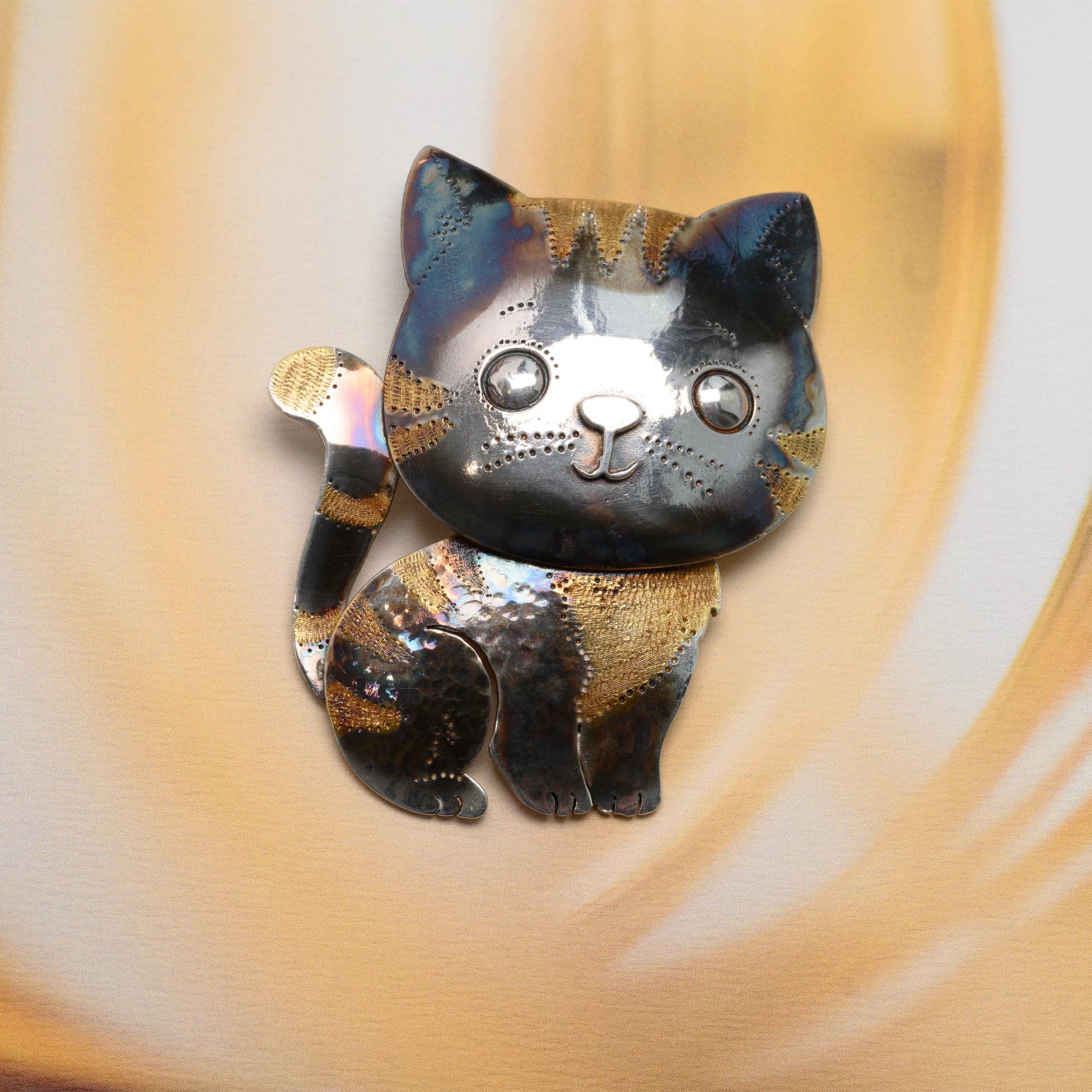 Broszka w kształcie modnego, artystyczne zdobionego kotka. Wykonana specjalnymi metodami: wielobarwnego oksydowania termicznego, młoteczkowania, pozłacania. Tworzona w całości ręcznie, przez Krakowskiego artystę. Można ją nosić również jako naszyjnik - łańcuszek do zakupienia dodatkowo poprzez wybranie opcji (40 cm lub 70 cm)