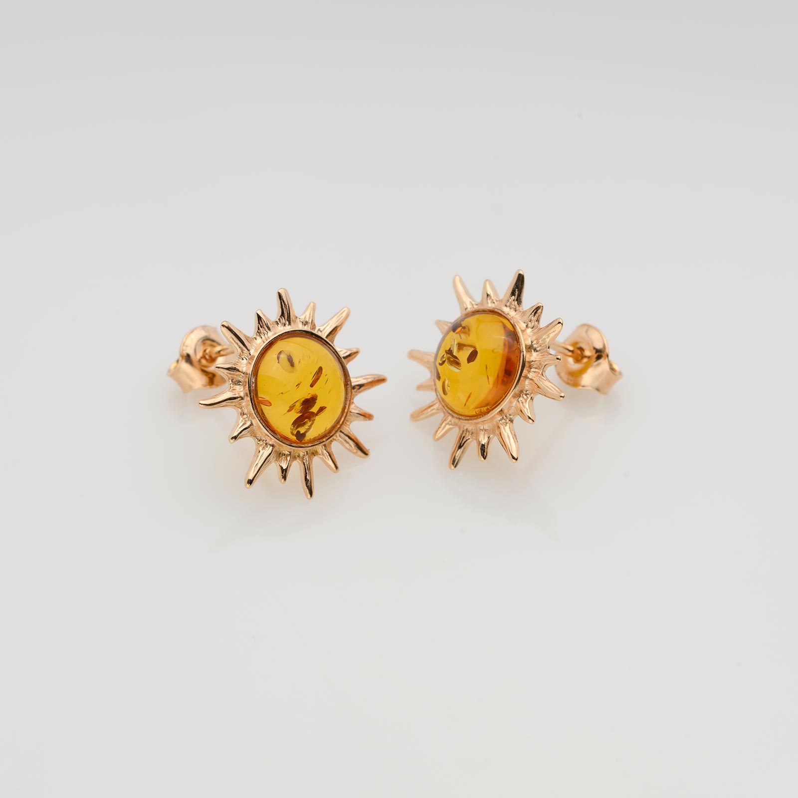 Pełne blasku kolczyki w kształcie słoneczek, wykonane z najwyższą precyzją. Centralny element stanowi naturalny bursztyn bałtycki w ciepłym, miodowym odcieniu, oprawiony w pozłacany srebro. Idealne dla osób ceniących oryginalność, słońce i pozytywną energię.
