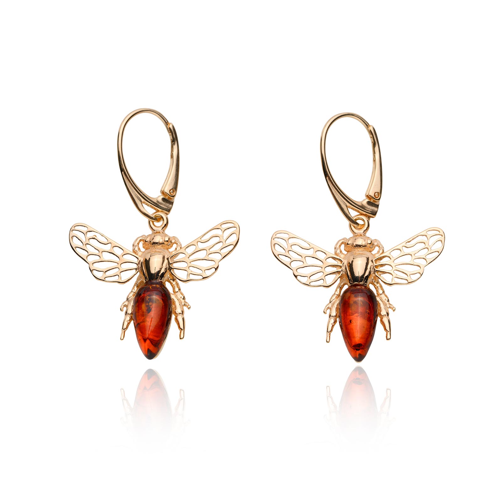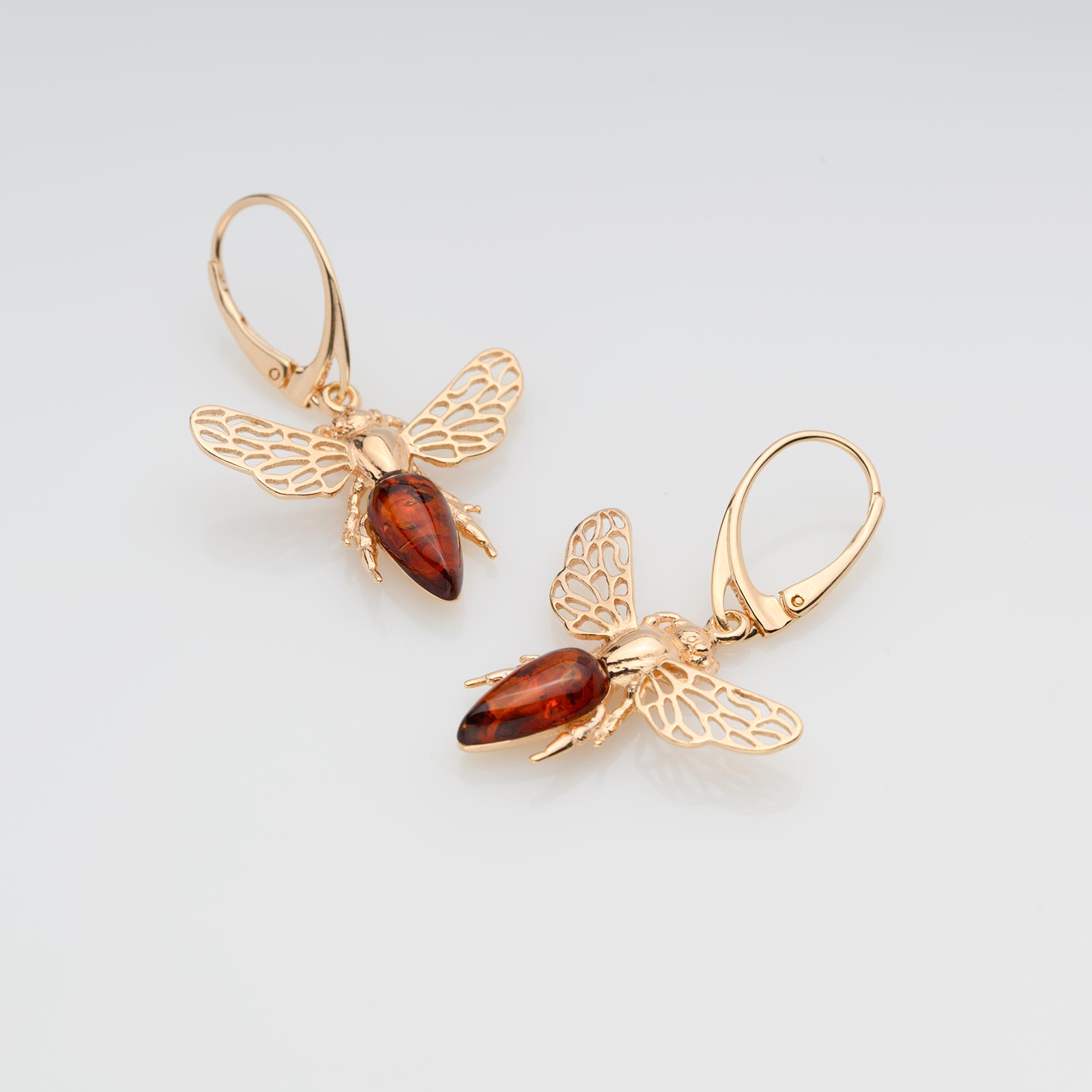 Kolczyki srebrne pozłacane - pszczoły z bursztynem
