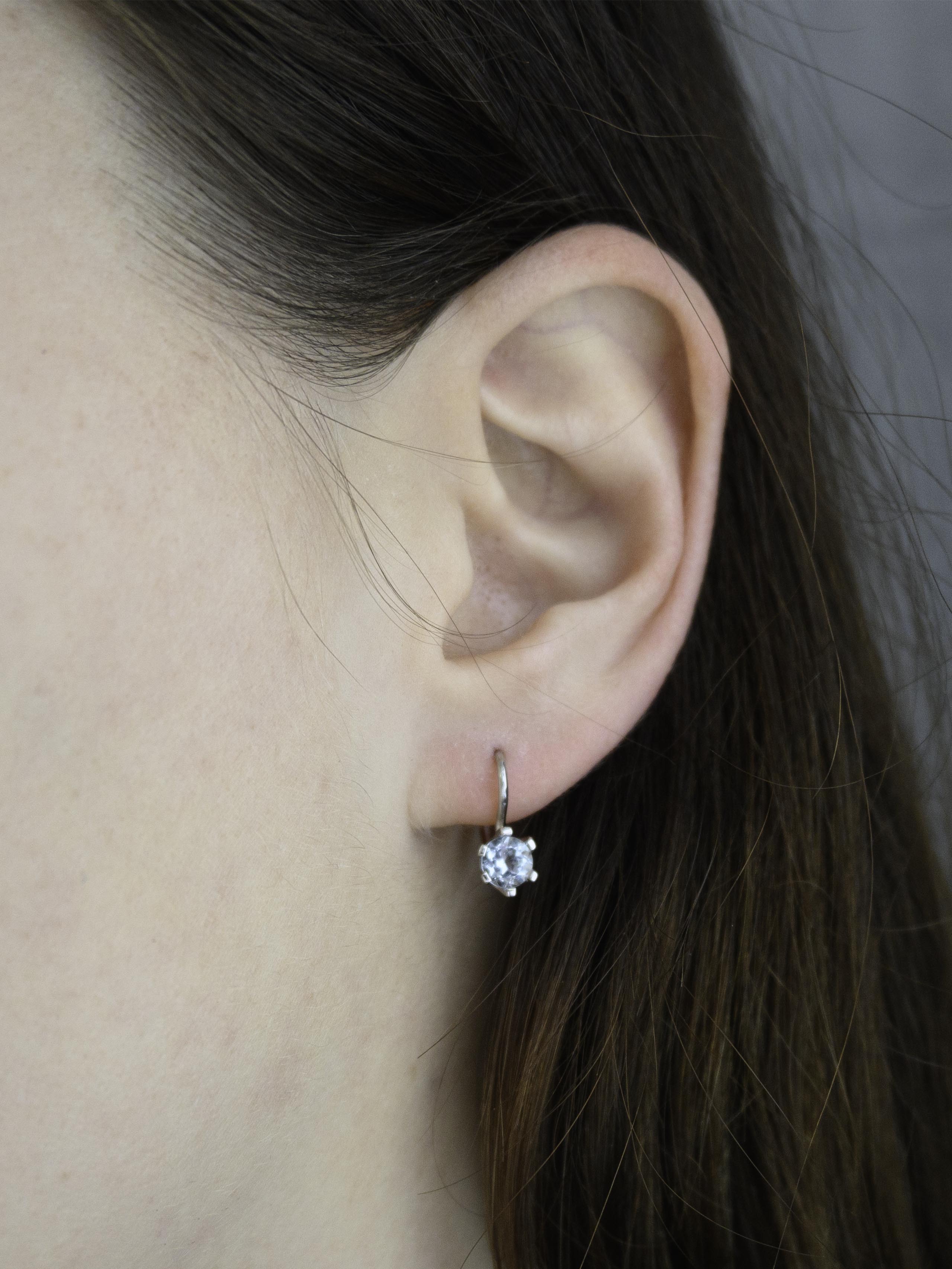 Śliczne kolczyki wykonane z białego złota próby 585 zdobione okrągłymi topazami o średnicy 5mm. Długość kolczyków: 15mm, waga: 2,7g.