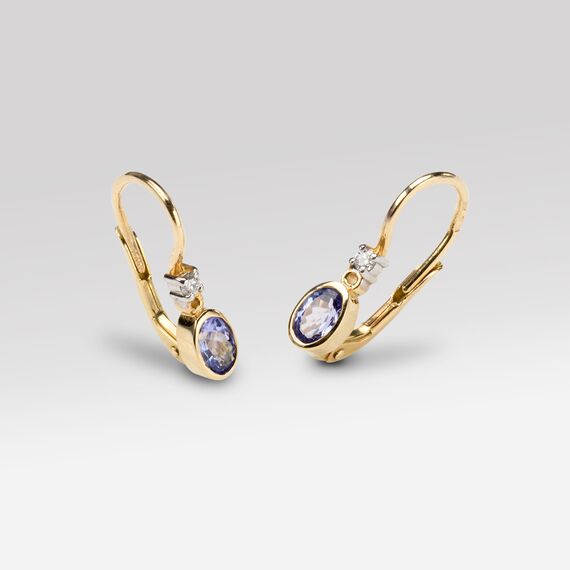 Śliczne, urocze i niepowtarzalne ! Kolczyki wykonywane ręcznie ze złota próby 585 z tanzanitami i brylantami. Naturalne kamienie: tanzanity o wymiarach 6 x 4 mm oraz brylanty 2 sztuki o łącznej masie 0,06 ct H/Si. Wielkość kolczyków, długość ok. 2 cm, waga ok. 2,5 g. W kolczykach jest zastosowane bardzo wygodne i solidne zapięcie angielskie.