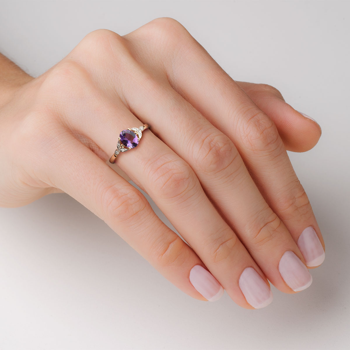 Marie - tajemnicza i zmysłowa ! Hipnotyczna głębia ametystowego fioletu, chłód brylantów i słoneczne ciepło żółtego złota - kalejdoskop barw i znaczeń. Nowa dziewczyna w rodzinie - czy będzie tak popularna jak Margaret ? Ten pierścionek zdobi duży ametyst, małe brylanciki i jest wykonany z żółtego złota próby 585. Ametyst o wymiarach 8x6mm, brylanty 6 szt, łącznie: 0,06ct. Waga: 2,6g. Marie - mon amour.