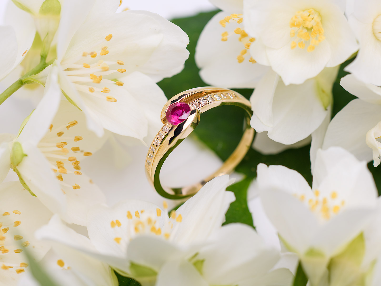 MIŁY - Elegancki Złoty Pierścionek z Rubinem i Diamentami.