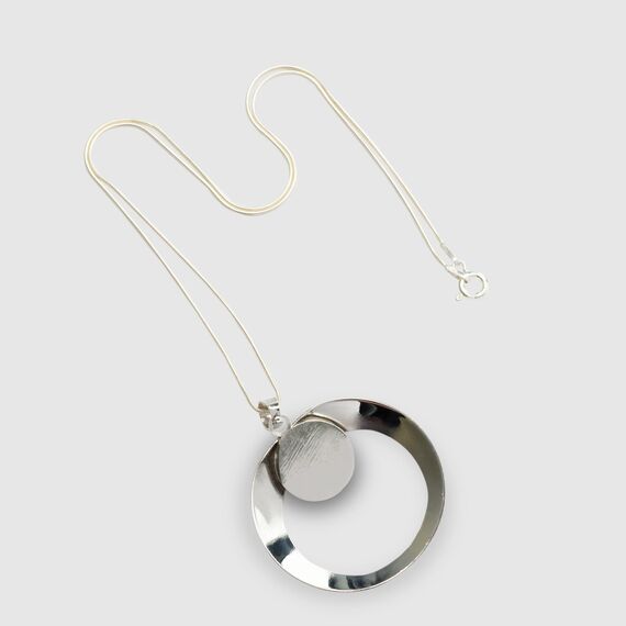 Krzemień pasiasty w formie kółka oprawiony jest przestrzennie w srebro w formie kółka. Z tyłu oprawy zawieszki można wygrawerować krótki tekst.