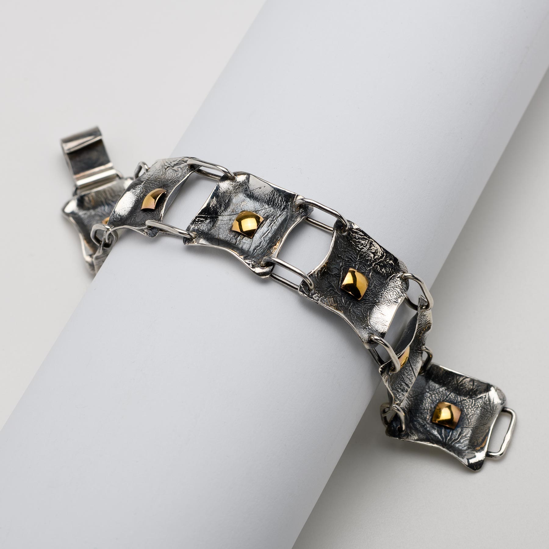 MOTIF - MODOWA KOLEKCJA - Modowa bransoletka ze srebra próby 925, delikatnie matowana i oksydowana, w środku każdego kwadracika elementy z blaszki złotej próby 585.