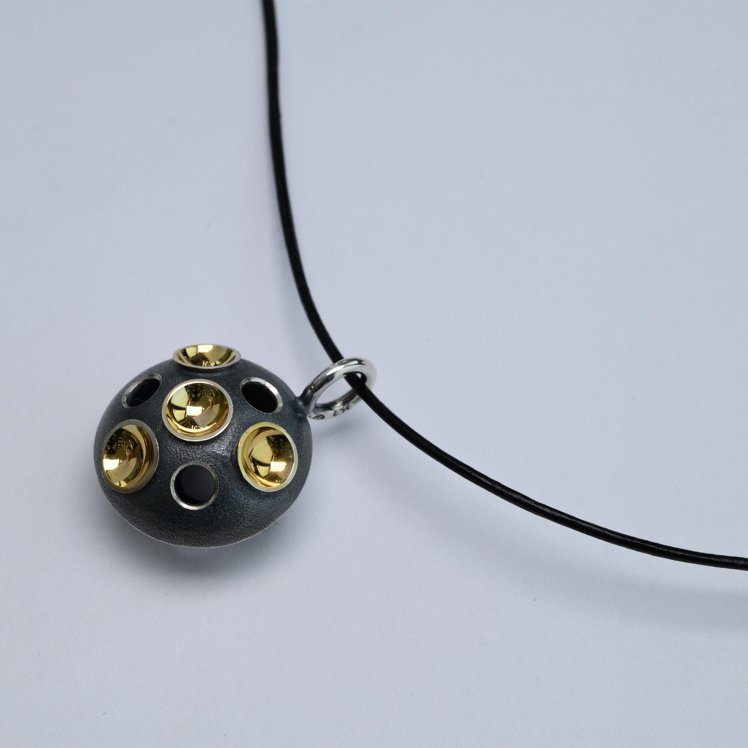 MOTIF - KOLEKCJA MODOWA - Naszyjnik okrągły w kształcie kulki lekko spłaszczonej, matowany i oksydowany, 4 okrągłe zdobienia z płytki złotej.
