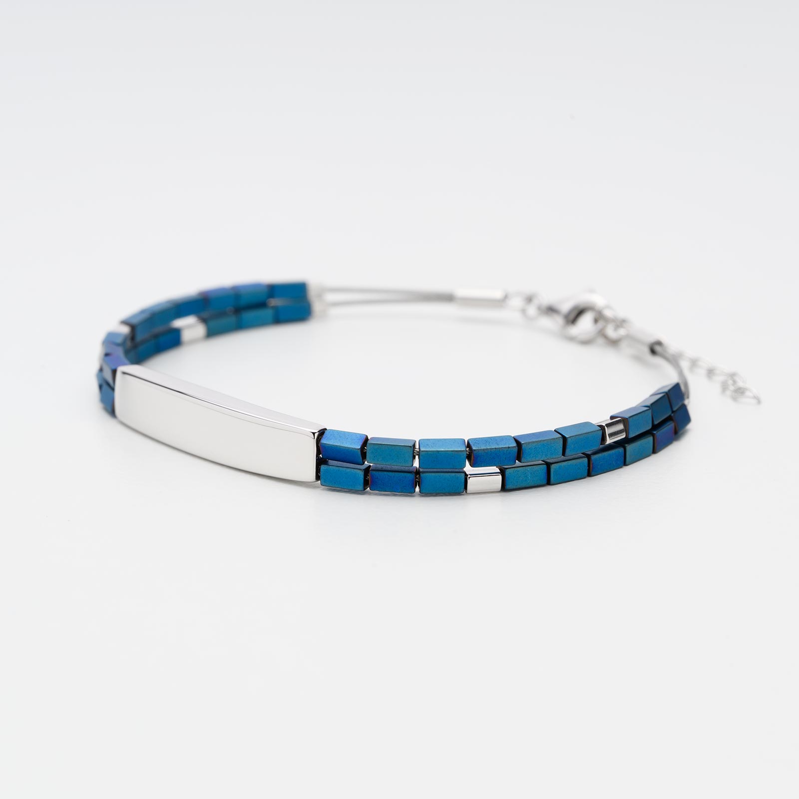 Koraliki z naturalnego hematytu o kształcie kostek zostały pokryte lśniącą, metaliczną powłoką w kolorze oceanicznego błękitu, ktore pięknie mieni się w świetle. Hematyt, znany ze swoich właściwości energetycznych i zdolności do stabilizacji, dodaje biżuterii dodatkowego znaczenia.