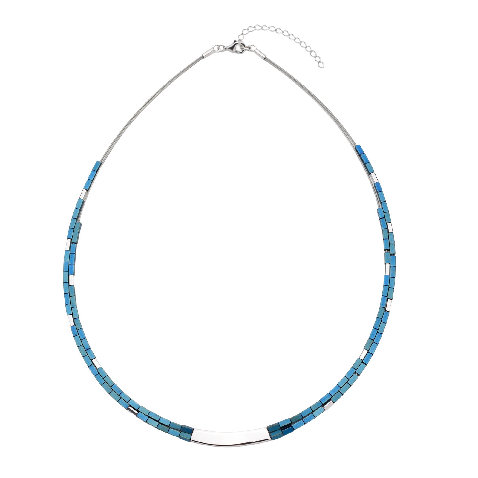 Elegancki i nowoczesny naszyjnik ze srebra i z hematytu o intensywnie niebieskim odcieniu, idealna dla kobiet. Ten unikalny dwurzędowy model łączy w sobie surowość kamienia naturalnego z luksusowym wykończeniem srebra próby 925 + rodowanie.