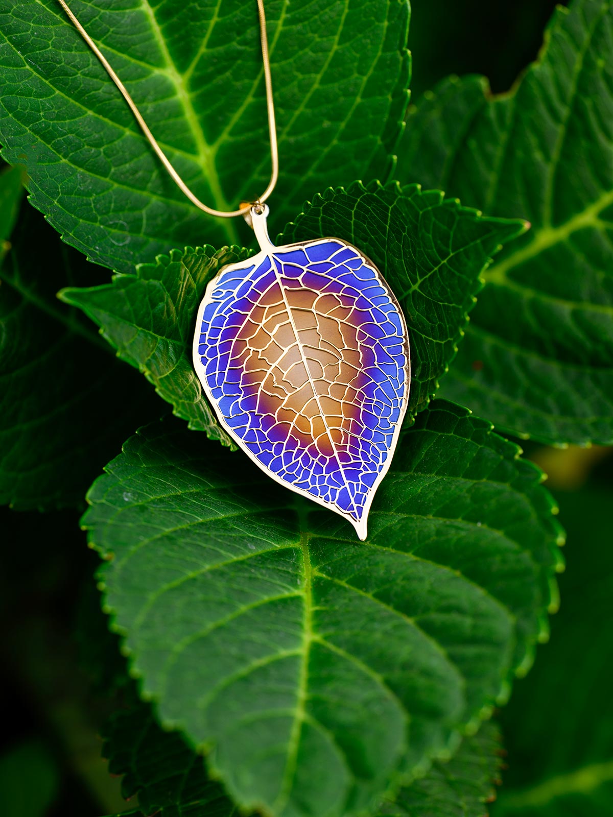 Wyjątkowy naszyjnik wykonany ze srebra próby 925, pokryty warstwą złota, z zawieszką w kształcie liścia. Wypełnienie tytanowe w wielobarwnych odcieniach – złota, fioletu i niebieskiego – tworzy zachwycający efekt przypominający barwy pawich piór.