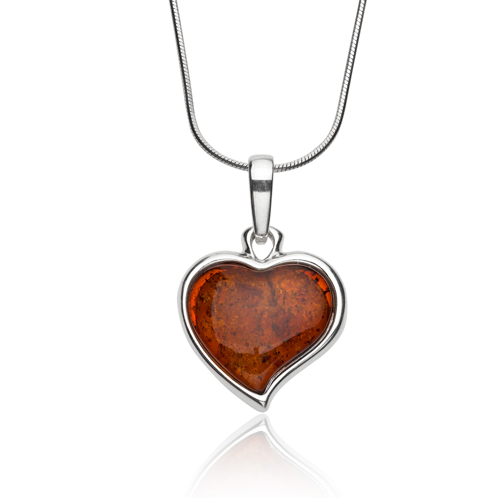 Bursztynowe serce oprawione w srebro próby 925 na łańcuszku typu żmijka o długości 40 cm. Wspomnienie wakacyjnych chwil... Delikatny i subtelny dodatek. Wymiary zawieszki, szer. 17 mm, dł. 20 mm, waga: 5,1 g.