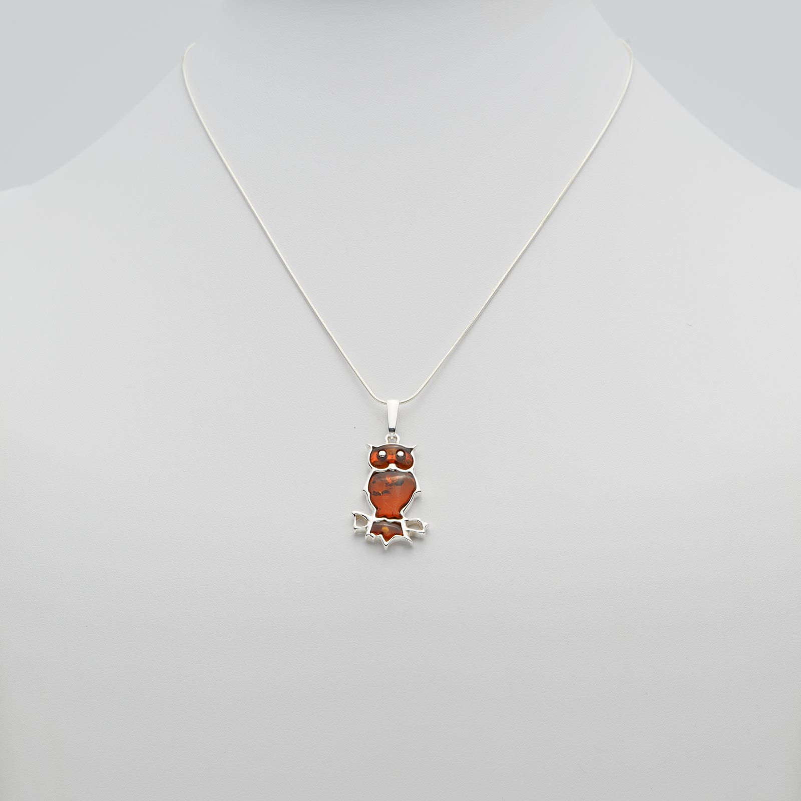 ZAWIESZKA - SOWA jest wykonana z bursztynu bałtyckiego w ciepłym, koniakowym (ciemnopomarańczowym/brązowym) kolorze. Bursztyn stanowi korpus sowy i jest osadzony w srebrnej ramce.