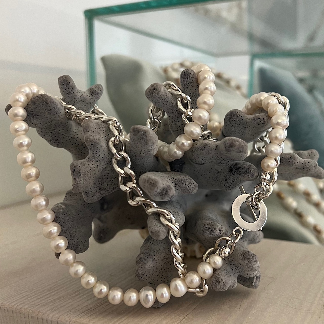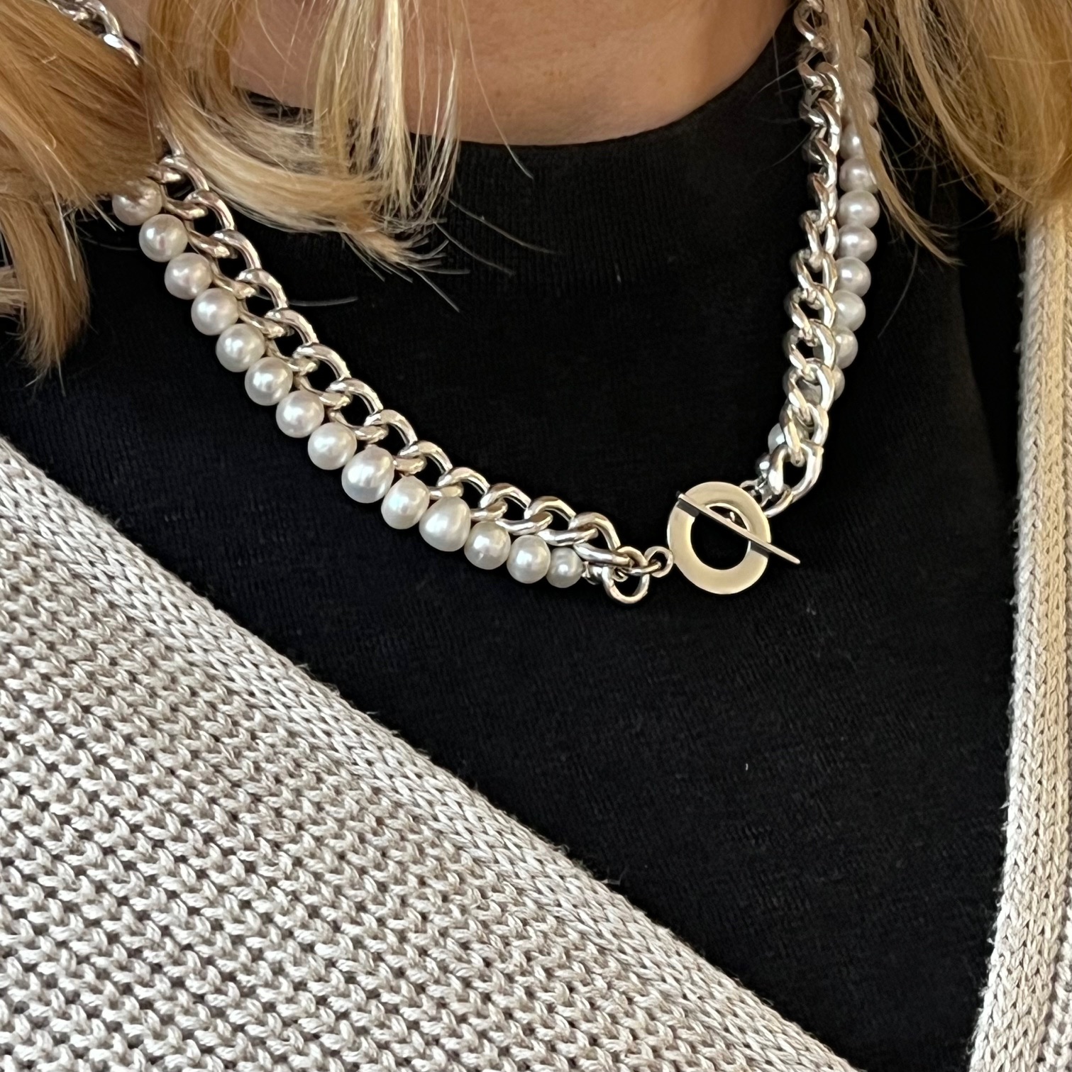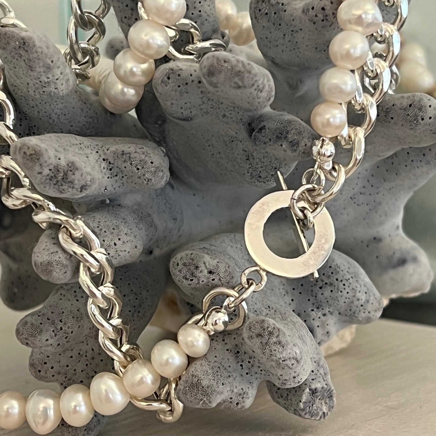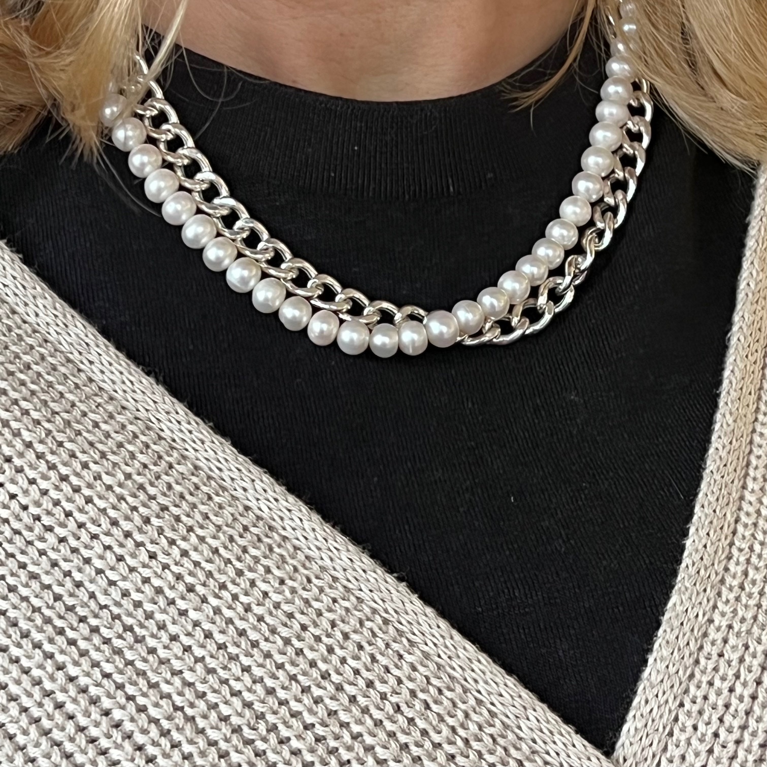 Razem tworzą duet kontrastów, które wzajemnie się dopełniają: srebrna struktura i perłowa łagodność, rytm metalu i szept natury. To naszyjnik dla kobiety, która łączy w sobie siłę i subtelność — i nosi je z taką lekkością, jakby były jej własną opowieścią.