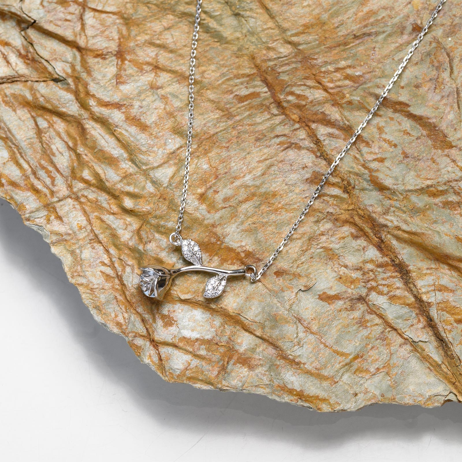 Naszyjnik wykonany ze srebra próby 925, dodatkowo rodowany zawieszka w kształcie róży łączy dwa łańcuszki, a jej listeczki zdobione są cyrkoniami.