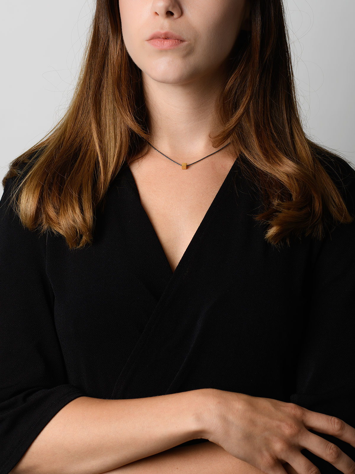 Delikatny, bardzo oryginalny naszyjnik z nowej kolekcji. Wykonany ze srebra - łańcuszek przyciemniany specjalną techniką, a na jego środku umieszczony jest mały pozłocony kwadracik o wymiarach 0,5 cm. Niezwykła ozdoba! Długość naszyjnika to ok 40,5 cm.