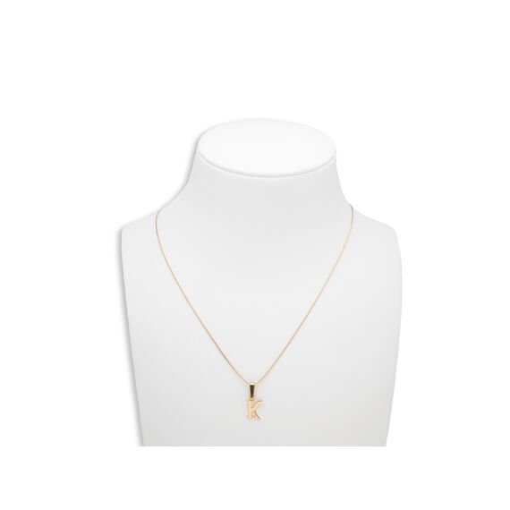 Wykonany w całości ze srebra próby 925, pozłocony 24-karatowym złotem. Do kompletu łańcuszek typu żmijka 40 cm. Waga całości ok. 2,3 g. Przykładowa literka "K" ma wymiary: 1,5 cm x 0,8 cm