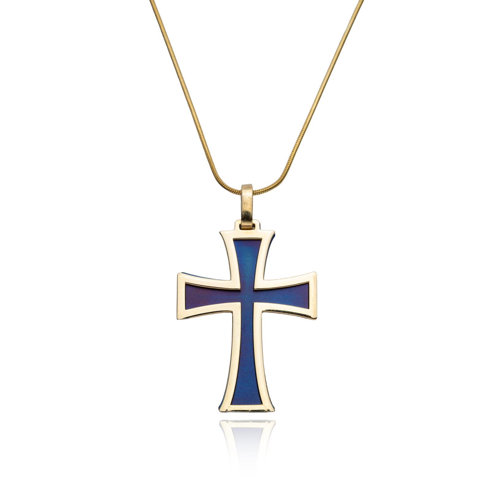 Naszyjnik srebrny pozłacany z krzyżykiem to biżuteria noszona zarówno jako symbol wiary, jak i modny dodatek. Wykonany jest z pozłacanego srebra 925 i tytanu w kolorze niebieskim.