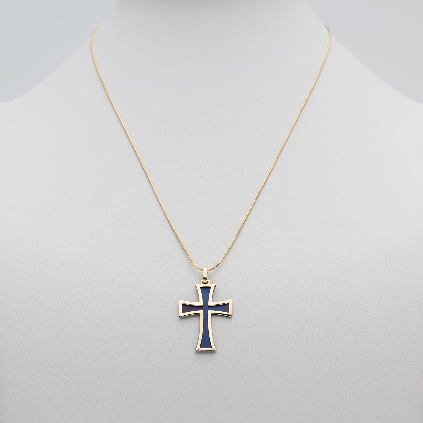 Krzyżyk z tytanowym zdobieniem w kolorze niebieskim dodaje biżuterii charakteru i modnego wykończenia.
