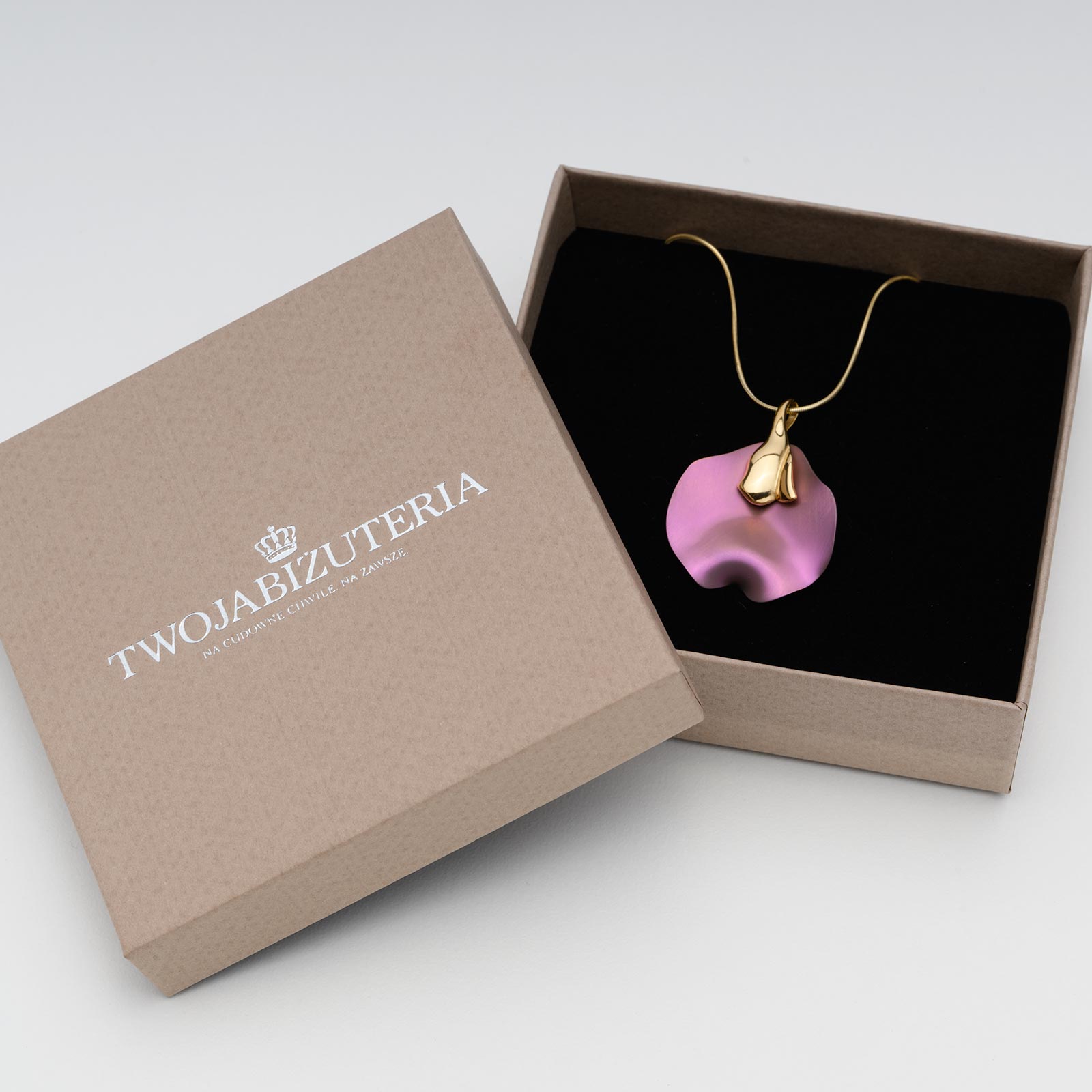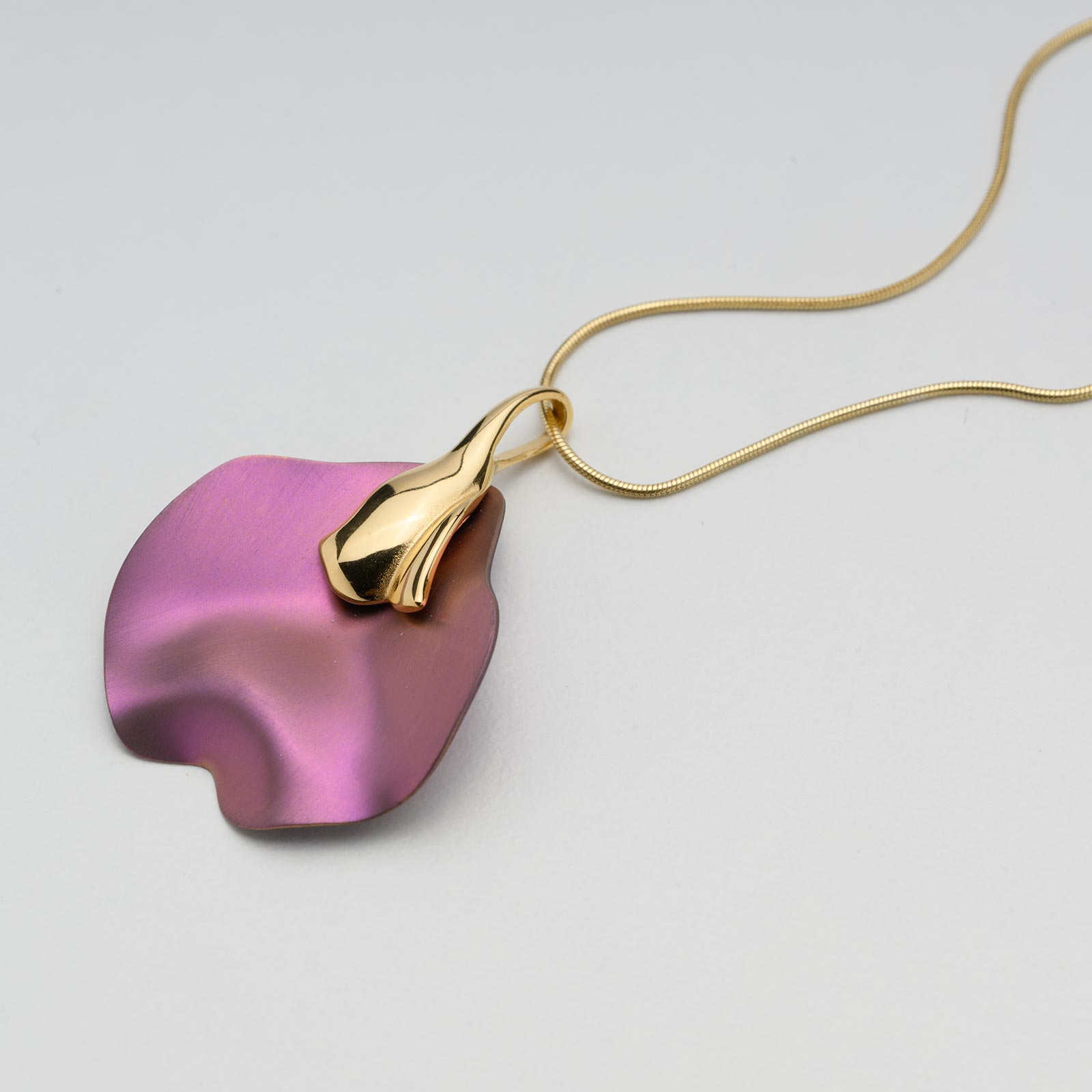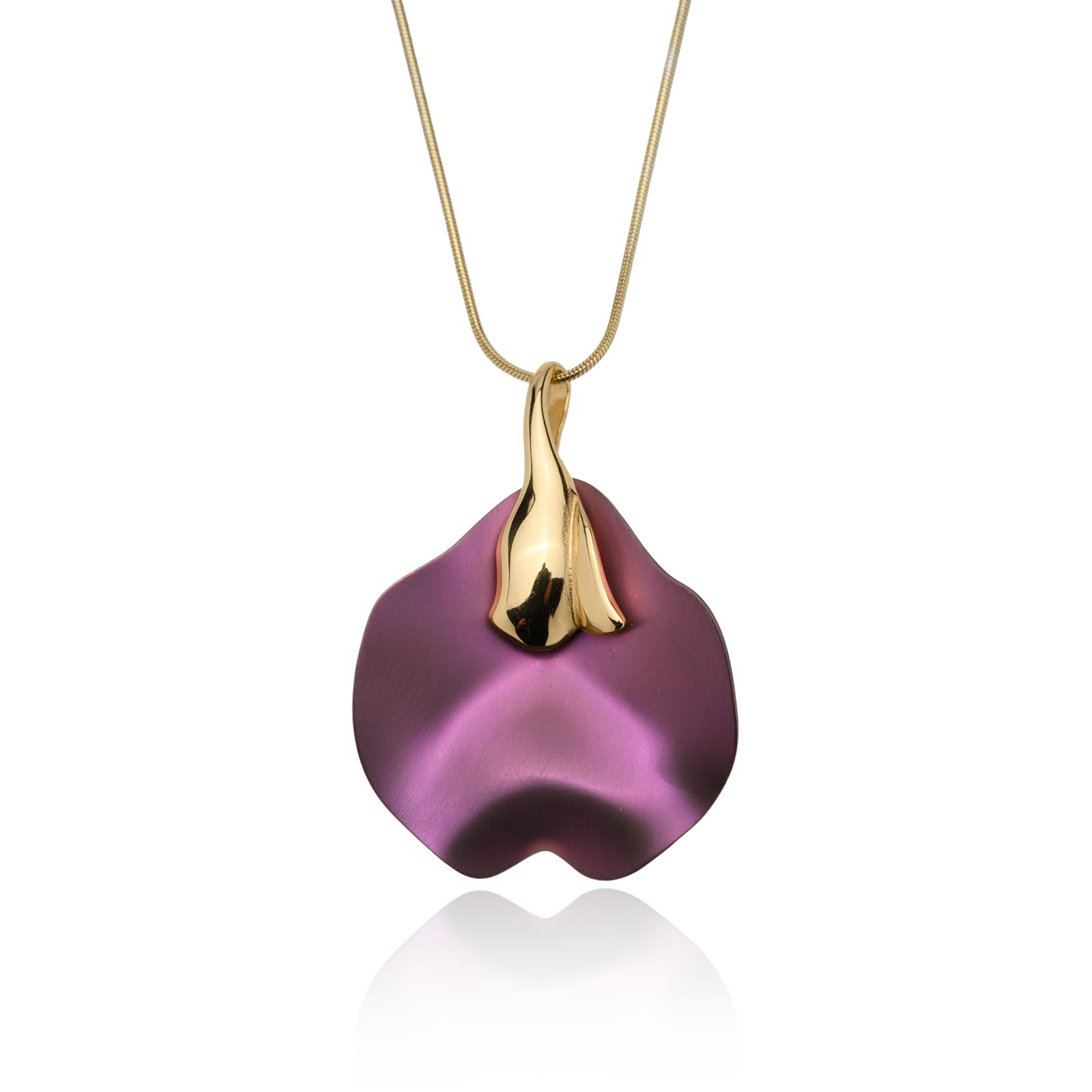 Wyjątkowy naszyjnik wykonany z najwyższej jakości srebra próby 925, pokrytego warstwą złota oraz ozdobiony tytanowym elementem w głębokim odcieniu fioletu w formie przestrzennego liścia- płatka kwiatu . Nowoczesna, opływowa forma inspirowana naturą przyciąga uwagę subtelnym połączeniem matowego tytanu i lśniącego złotego wykończenia.