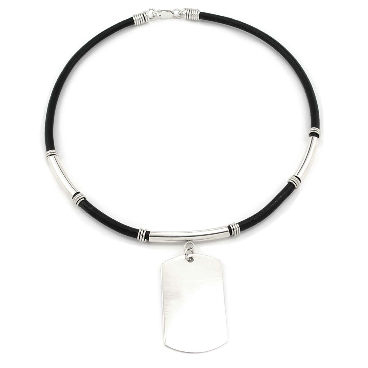 Naszyjnik wykonany z czarnego, skórzanego rzemienia o grubości 4,5 mm i zdobiony oryginalnymi wstawkami ze srebra. Do naszyjnika doczepiony jest srebrny nieśmiertelnik, srebrna blaszka przygotowana do wygrawerowania np. imienia, grupy krwi lub daty. Modny i oryginalny dodatek.