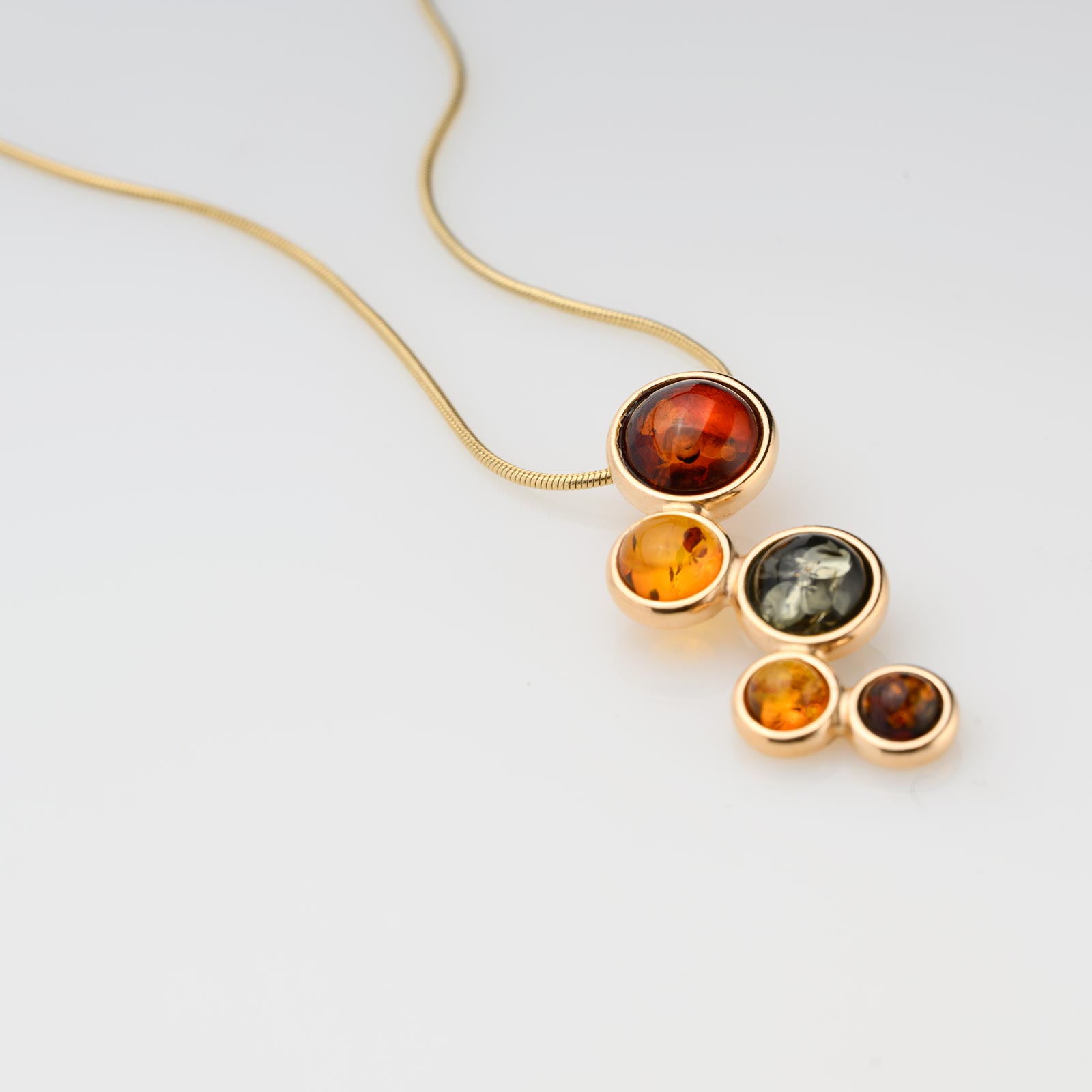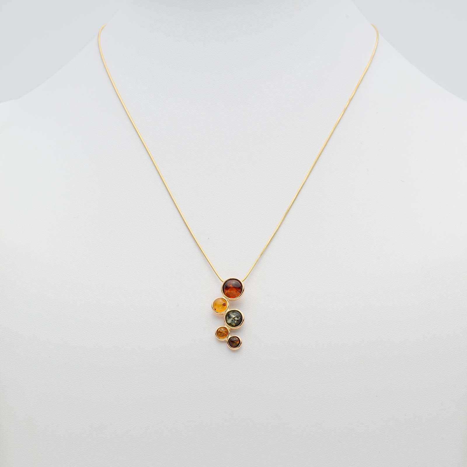Naszyjnik ma nowoczesny, a jednocześnie elegancki charakter. Kompozycja z bursztynów o różnych kolorach dodaje mu unikalności.