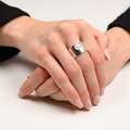 Pierścionek wykonany został ręcznie ze srebra próby 925, na końcu na specjalnie zdobionej powłoce umieszczona jest hodowlana perła. Dzięki temu że jesteśmy producentami, możemy wykonać pierścionek na konkretny rozmiar - dostępny jest rozmiar 14-15, na zamówienie inne rozmiary. Szer. obrączki ok. 1,30 cm.
