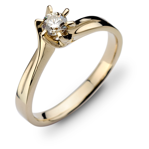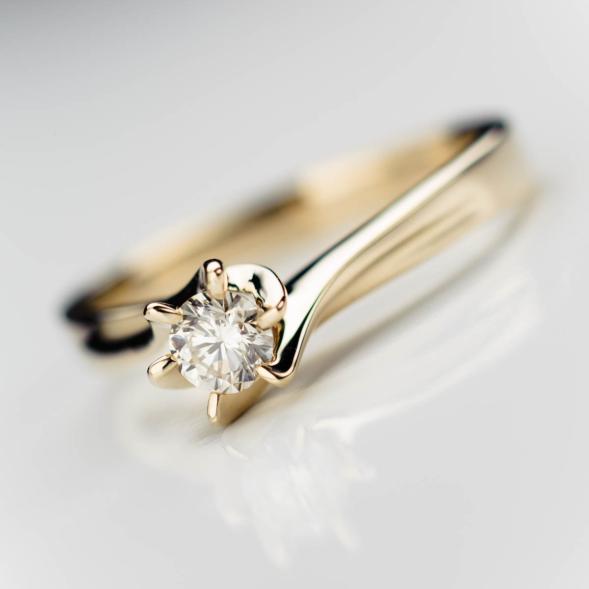 Elegancki pierścionek wykonany z żółtego złota próby 585 z brylantem o masie 0,23ct. Oprawa kamienia w formie zwijanych łapek. Całość polerowana. Klasyczny i prosty idealny na zaręczyny. Delikatna oprawa dla stanowiącego cały urok brylantu.