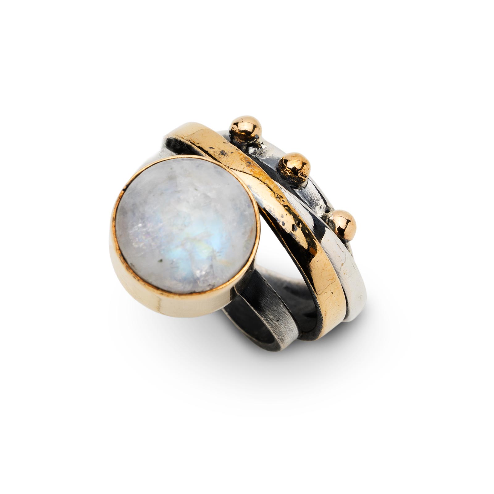 Centralnym elementem pierścionka jest duży kamień księżycowy o jasnym, perłowym, księżycowym połysku. Dodatkowym detalem są pozlacane elementy, które stanowią subtelny kontrast kolorystyczny.