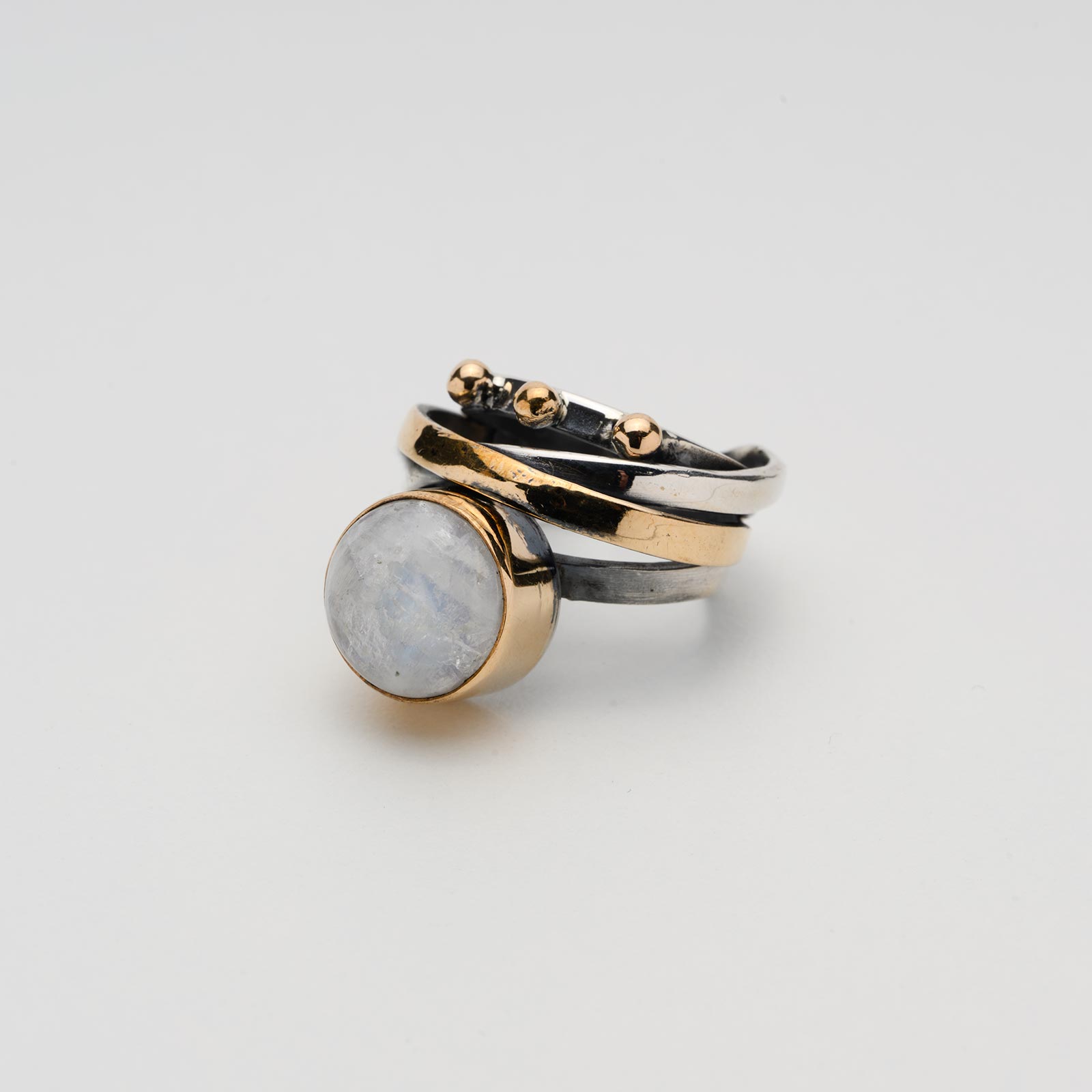 Pierścionek srebrny - artystyczny z kamieniem księżycowym i złotem