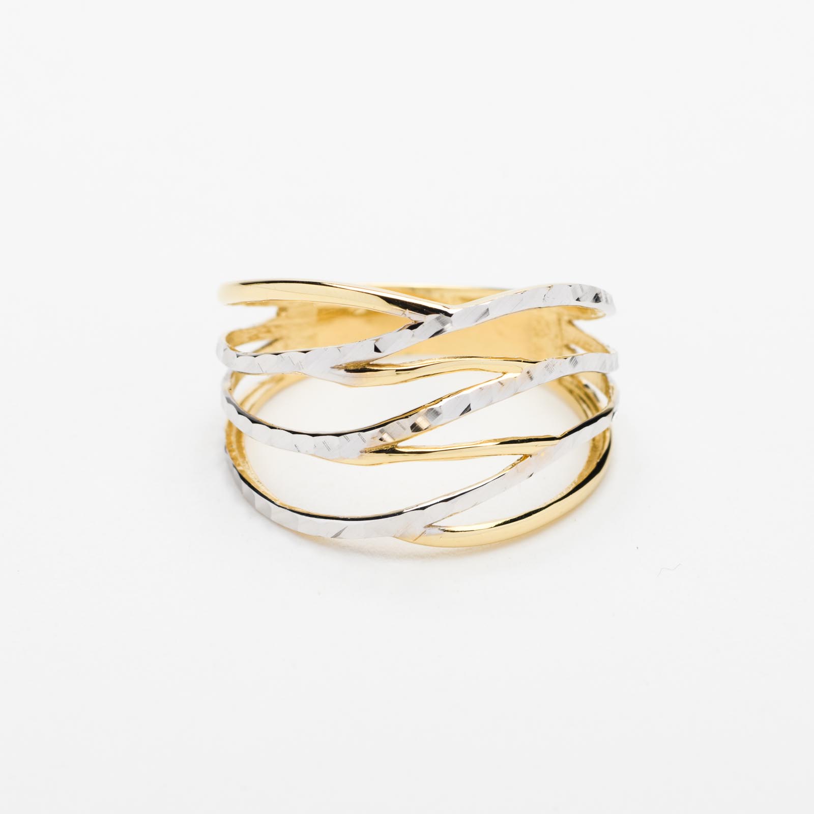 Pierścionek z żółtego złota próby 585 z delikatnych cieniutkich paseczków ozdobionych grawerem i połączonych razem.