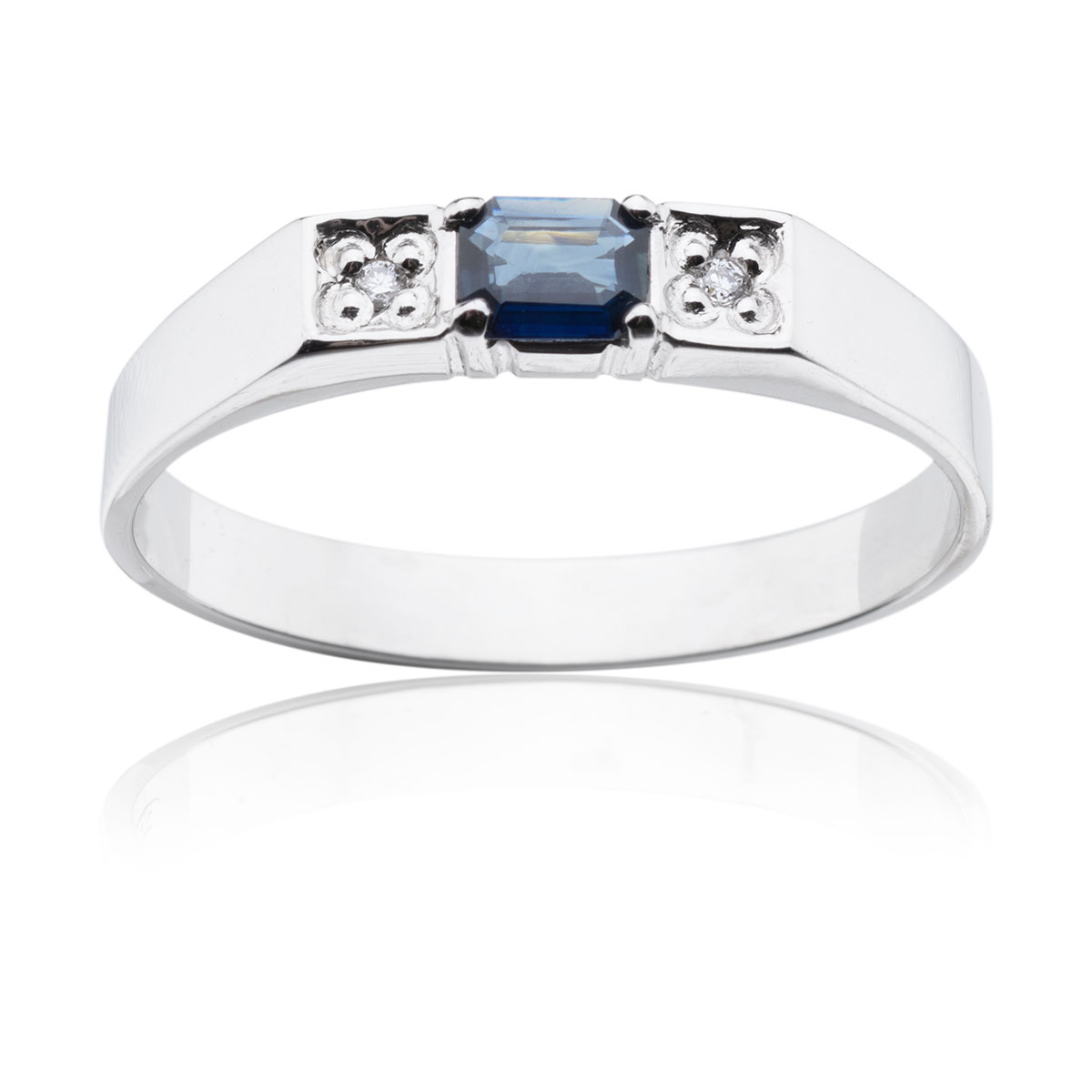 Pierścionek z białego złota próby 585 z szafirem i dwoma małymi brylancikami. Wymiary szafiru: 4x3mm, brylanty 2szt łącznie 0,02ct. Do kompletu polecamy złote kolczyki z szafirami k_111_j.