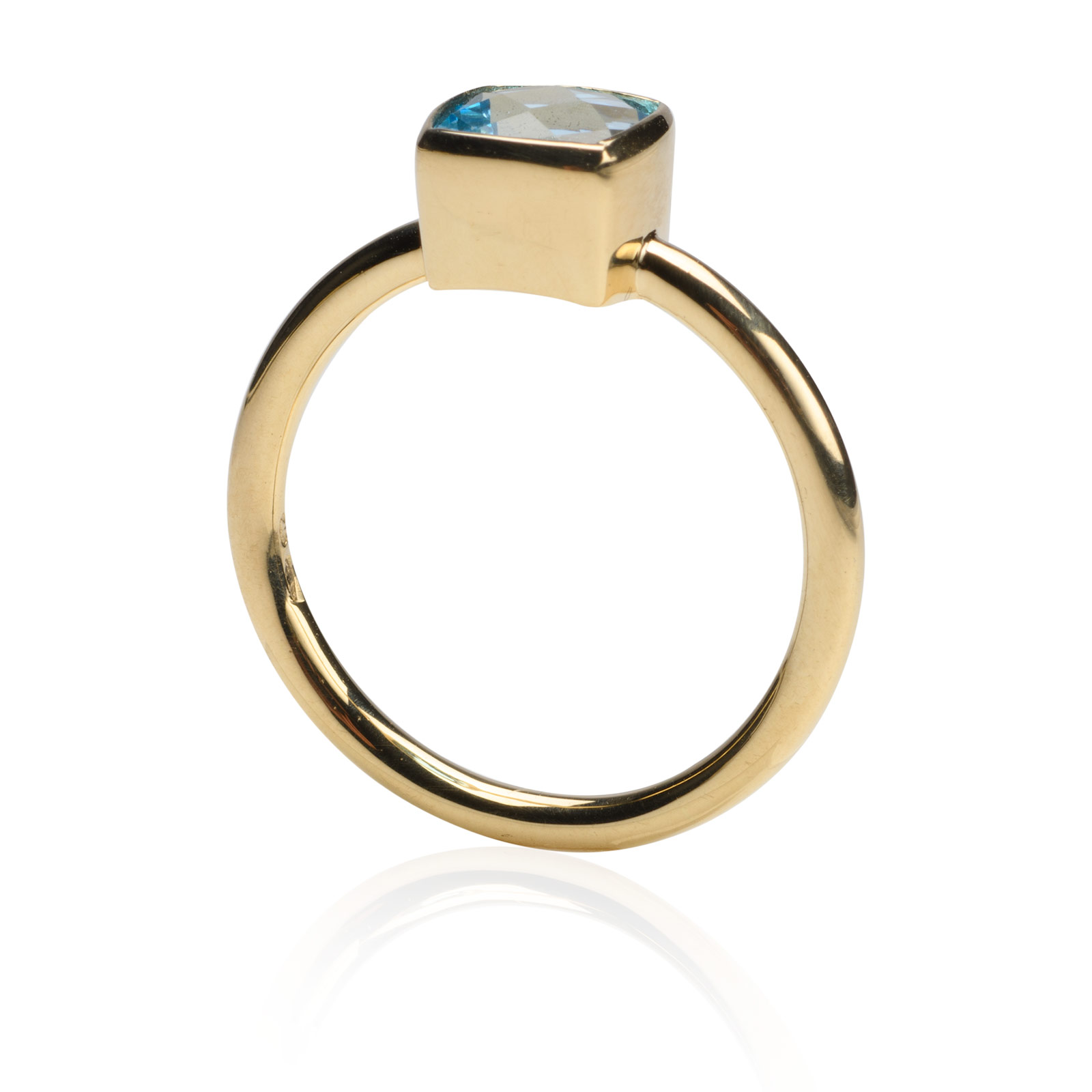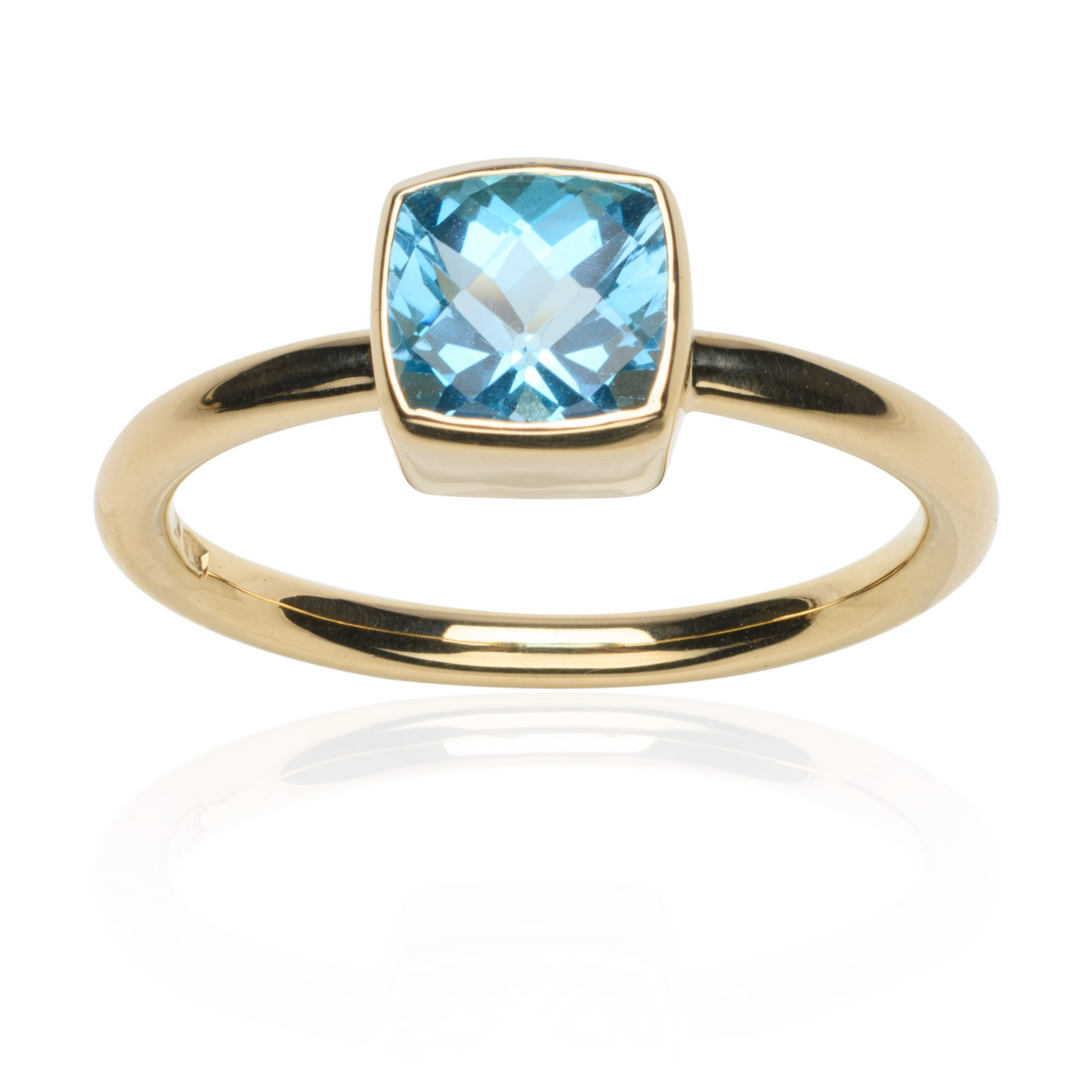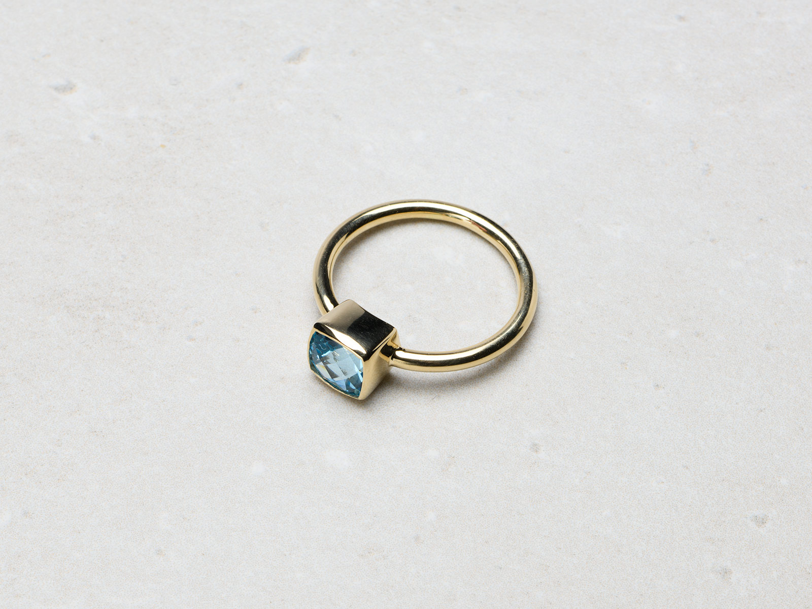 Oryginalny pierścionek wykonany ze złota próby 585 zdobiony naturalnym topazem. W pierścionku jest oprawiony kwadratowy topaz o wymiarach 7x7mm. Oprawa pełna, bardzo solidna, dobrze trzymająca kamień. Obrączka o okrągłym przekroju. Waga pierścionka ok. 3,8g, materiał: złoto 585, kamień: topaz naturalny 7x7mm. Do kompletu dostępne kolczyki k411a.