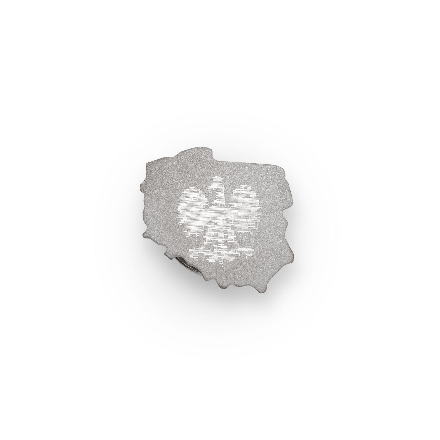 Przypinka do klapy marynarki w kształcie Polski z orzełkiem. Przypinka wykonana jest z matowionego srebra próby 925, orzełek wykonany jest techniką laserowego grawerunku. Wymiary przypinki: 16 x 16mm, waga ok. 1,5g.