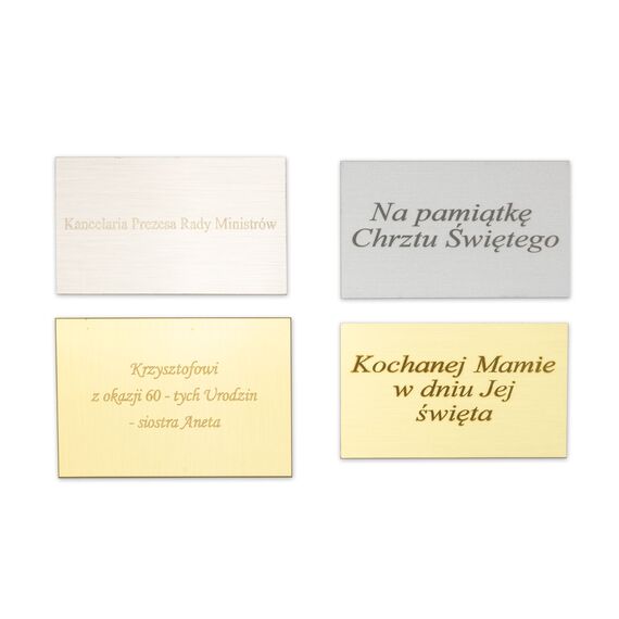 Spersonalizuj swój prezent ! Dołącz do pudełka pamiątkową blaszkę z grawerowaną dedykacją umieszczoną wewnątrz wieczka. Metalową blaszkę w kolorze złotym lub srebrnym możesz zamówić pod tym linkiem: https://www.twojabizuteria.pl/tabliczka-z-grawerem-dedykacja.html. Grawer wykonywany jest za pomocą komputerowej frezarki grawerniczej czcionką ozdobną lub prostą. Istnieje również możliwość wygrawerowania firmowego loga.