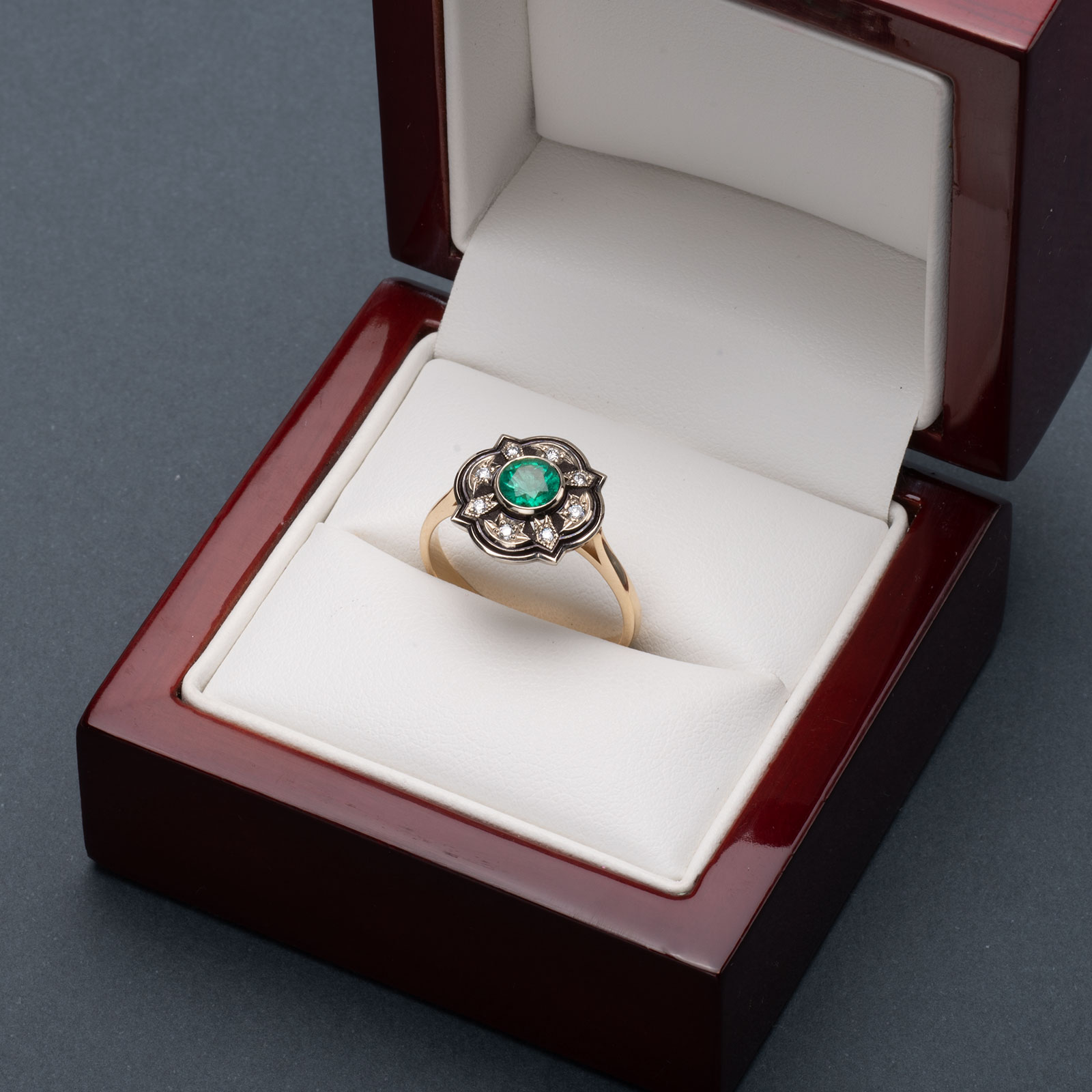 Pierścionek o niespotykanym kształcie, opartym na grze czworokątów z niezwykle dekoracyjnym zdobieniem na obwodzie korony. Centralne miejsce zajmuje przepiękny, naturalny szmaragd w pełnej oprawie. Całości dopełnia 8 sztuk brylantów rozmieszczonych dookoła szmaragdu. Pierścionek wykonany jest ze złota próby 585, szmaragd naturalny o masie 0,52ct, brylanty łącznie 0,10ct. t, Barwa H do G , czystość VS2. Waga pierścionka ok. 3,45g