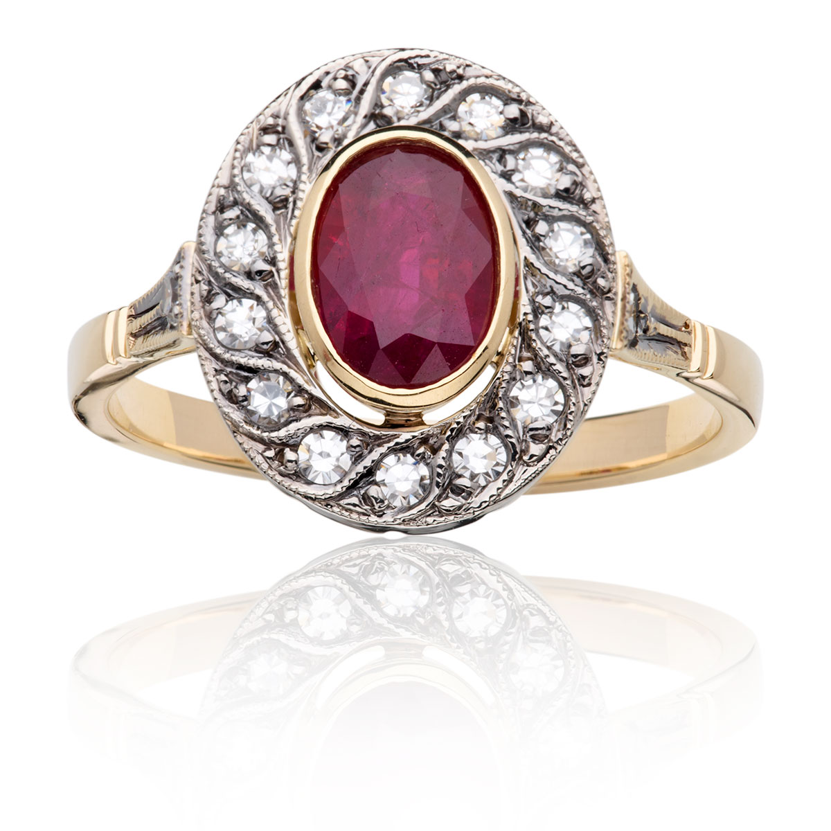 Księżniczka wśród pierścionków - rubin, brylanty i złoto 585 z misternym zdobieniem wokół. Uroda tego pierścionka ujawnia się po założeniu na palec - jego piękno zwróci uwagę każdego, jego blask onieśmieli nie jedną osobę. Jednym słowem artyzm proszę Państwa i wysoka kultura wykonania. Rubin 5x7mm, diament - H/VS 16szt łącznie ok. 0,25ct.