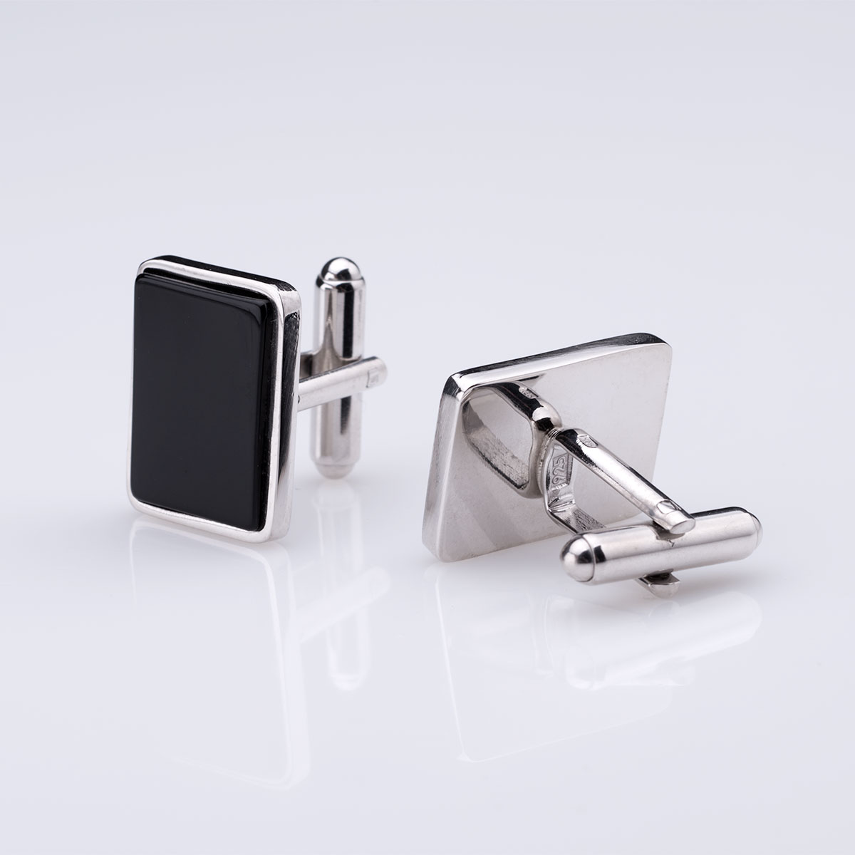 Znakomicie prezentujące się, nowoczesne spinki męskie do mankietów wykonane ze srebra próby 925 zdobione naturalnym onyksem. Wymiary spinek: 18 x 14mm. Waga całości: ok. 11,0g. Pudełko przedstawione na zdjęciu do kupienia osobno tutaj.