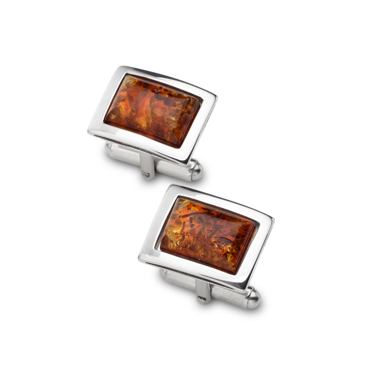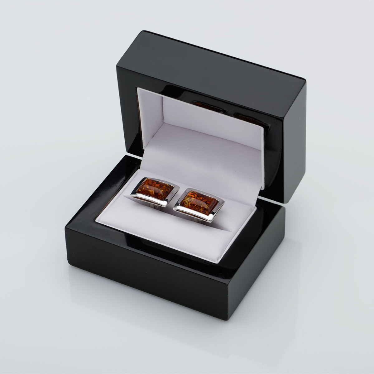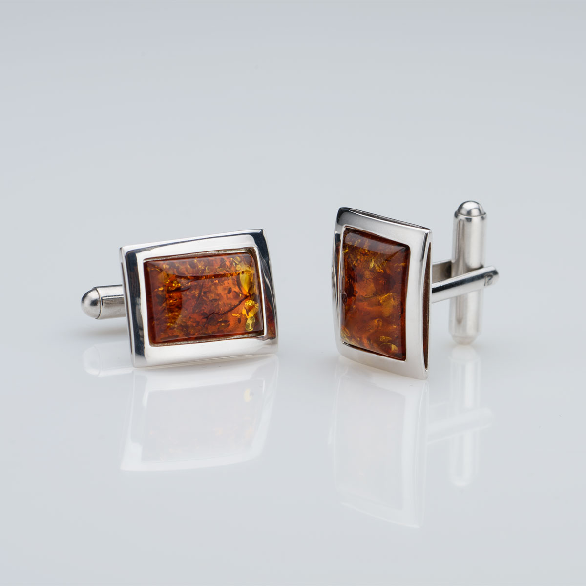 Średniej wielkości, prostokątne spinki męskie do mankietów wykonane ze srebra 925, zdobione bursztynem. Wymiary spinek ok. 20x15mm. Spinki standardowo wysyłamy w kartonowym, ozdobnym pudełeczku.