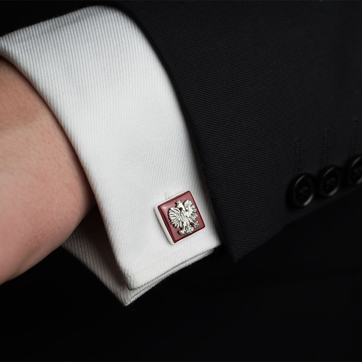 Piękne spinki do mankietów z godłem Polski - dla patriotycznie nastawionego mężczyzny. Spinki wykonane są ze srebra 925, zdobione srebrnym orzełkiem. Wymiary spinek 16x16mm, waga: ok. 13g.