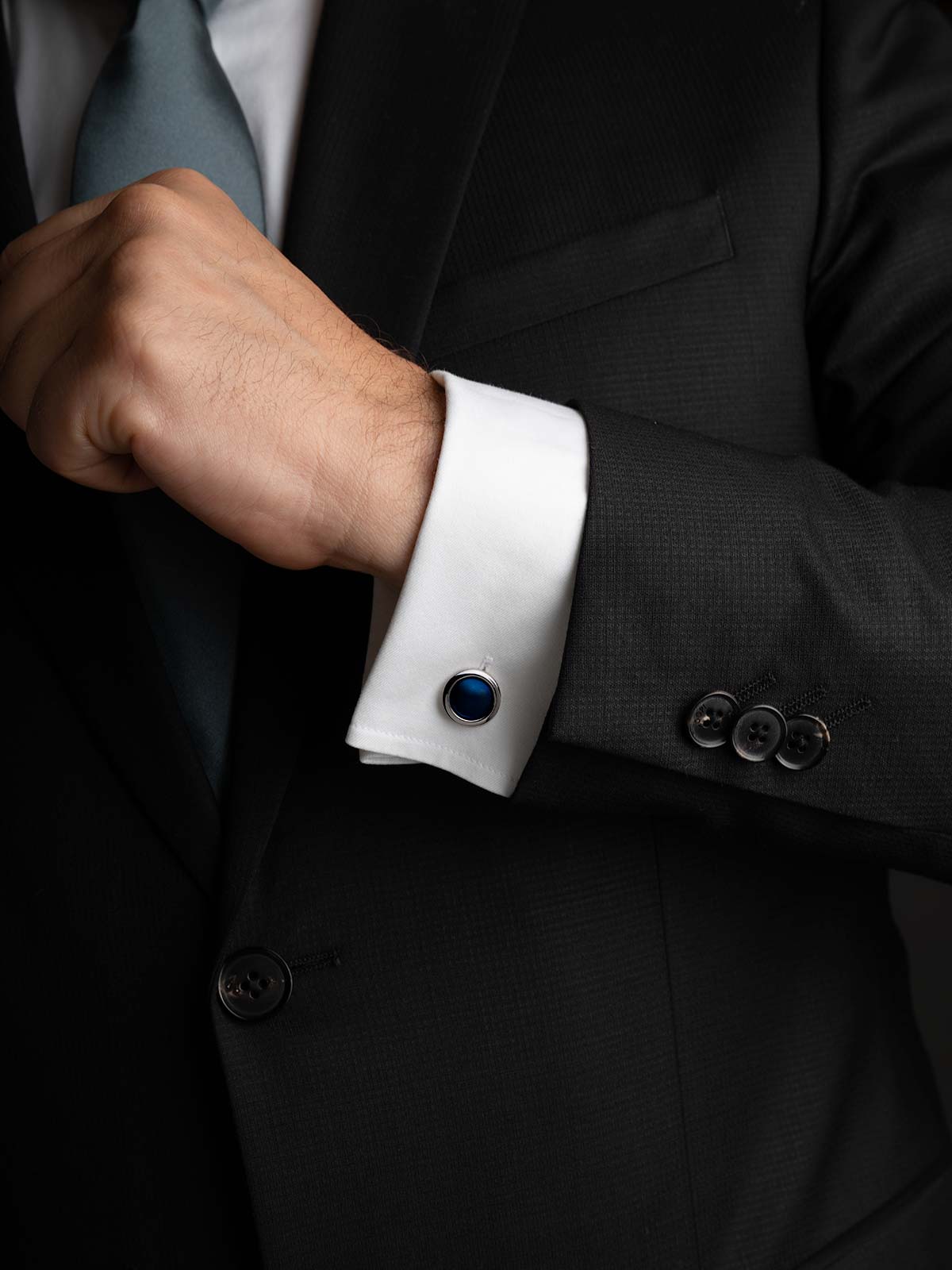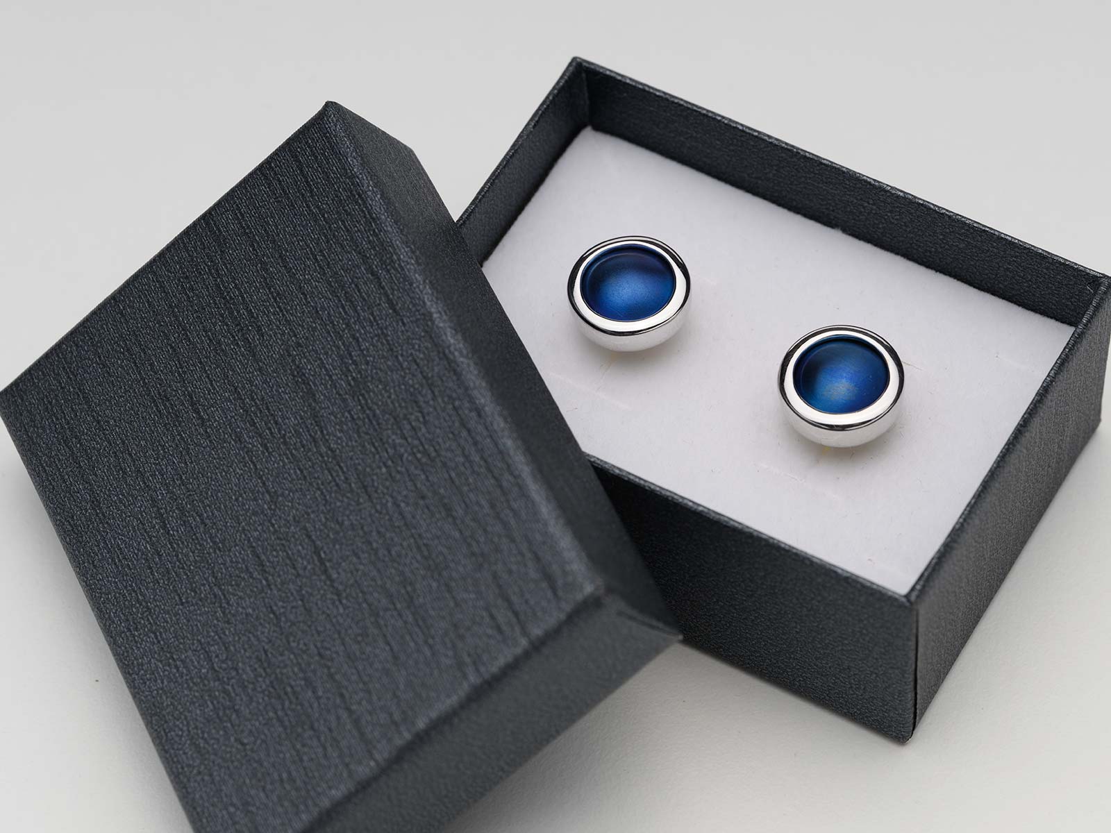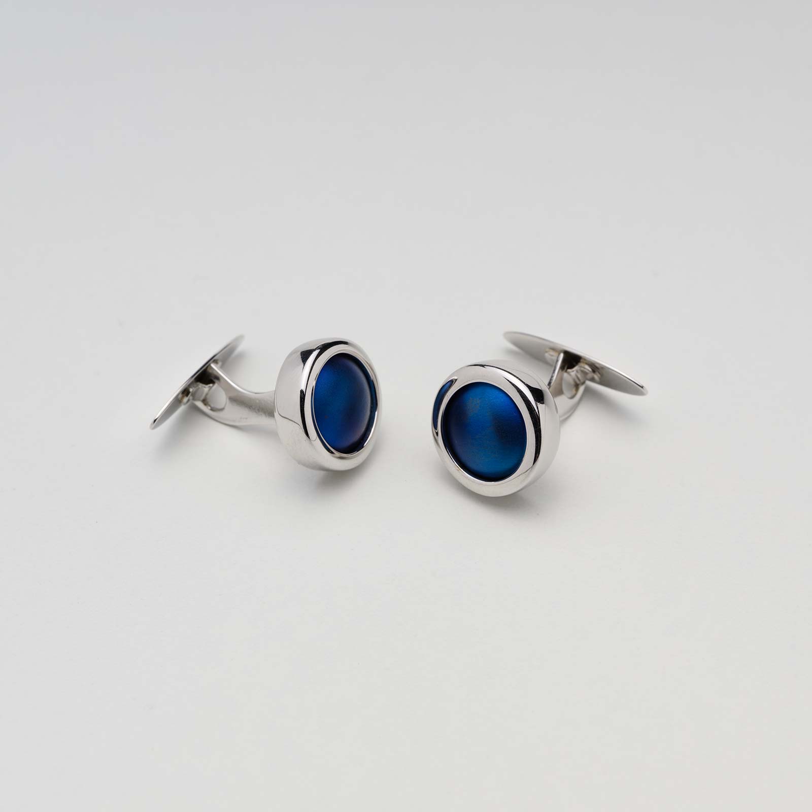 Spinki do mankietów wykonane całkowicie ze srebra próby 925 ozdobione wstawką tytanową, matową w kolorze niebieskim. Spinki mają kształt okrągły i są pokryte warstewką rodu, metalu, który zabezpiecza srebro przed oksydowaniem i nadaje mu lustrzany połysk. Spinki prezentują się niezwykle elegancko, są znakomitym prezentem z okazji ślubu, urodzin, imienin lub innych okazji typu matura, studniówka, awans, habilitacja lub wizyta u Prezydenta (kraju lub miasta). Średnica spinek: 15mm. Materiał: srebro 925, waga około 7,50g. Spinki pakujemy standardowo w kartonowe pudełeczko pokazane na zdjęciu lub w pudełeczko firmowe w kolorze beżowym.