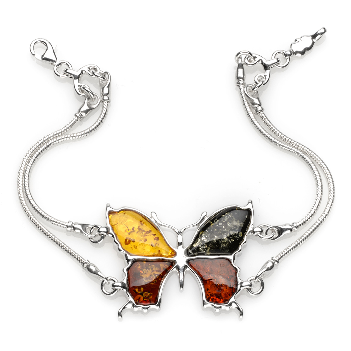 Bransoleta srebrna próby 925 z naturalnym, koniakowym bursztynem w formie motyla, piękny, oryginalny i klasyczny wzór. Wielkość elementów: motyl 35 x 30 mm. Długość całkowita bransolety to 18,5cm