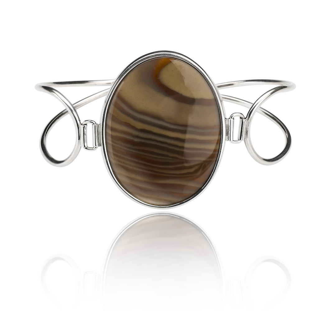 Bransoleta wykonana ze srebra próby 925 z krzemieniem pasiastym nazywanym Polskim Diamentem. Elegancki i okazały drobiazg! Wzór pasków w krzemieniu jest unikalny dla każdego egzemplarza i może być inny od pokazanego na zdjęciu.