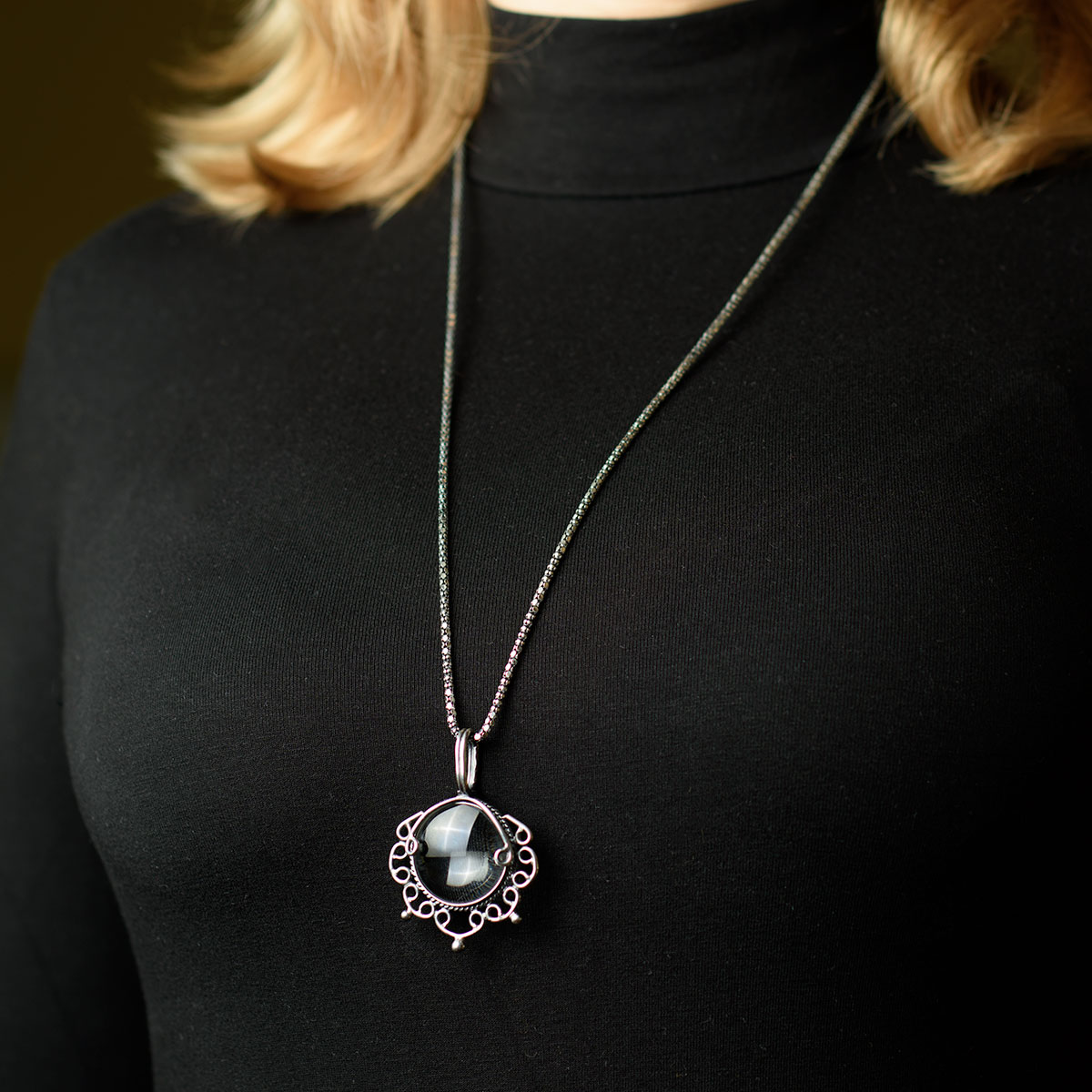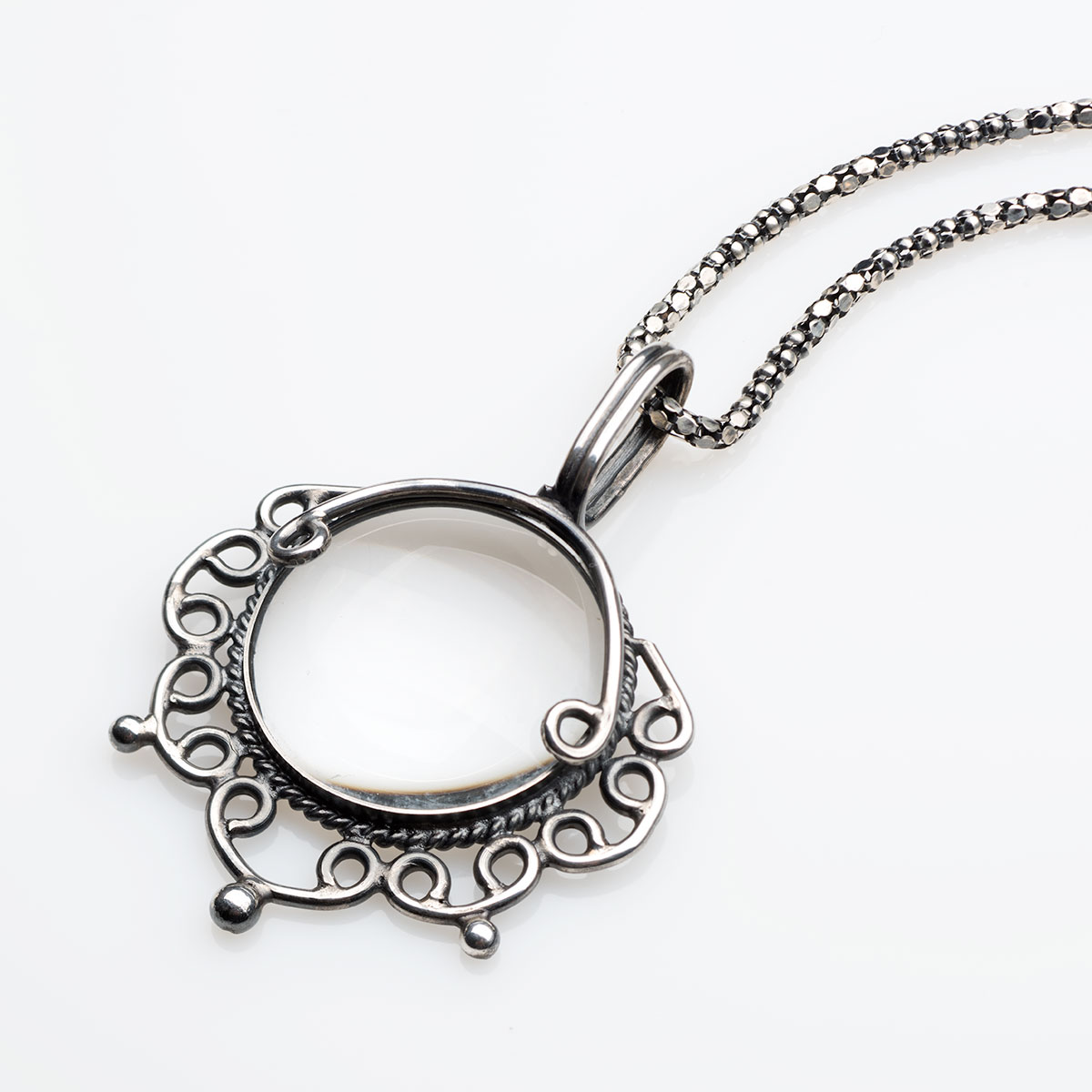 Naszyjnik srebrny i lupa w jednym . Idealne połączenie sztuki użytkowej z ozdobną. Pięknie ręcznie wykonany naszyjnik przez artystę jubilera z Krakowa.