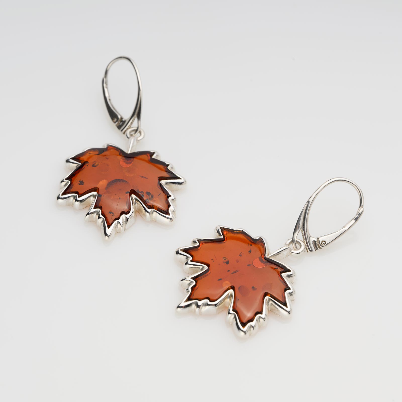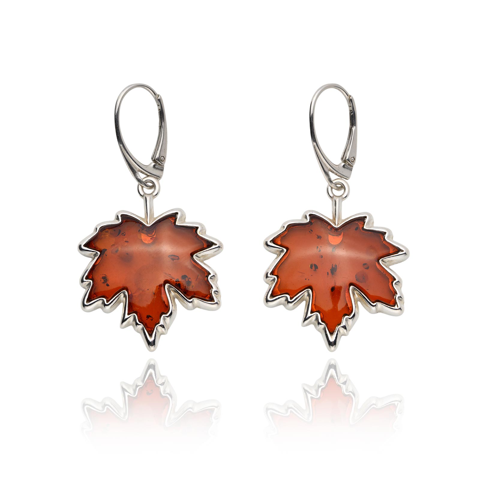 SREBRNE KOLCZYKI WISZĄCE Z NATURALNYM BURSZTYNEM W KSZTAŁCIE LIŚCI KLONU