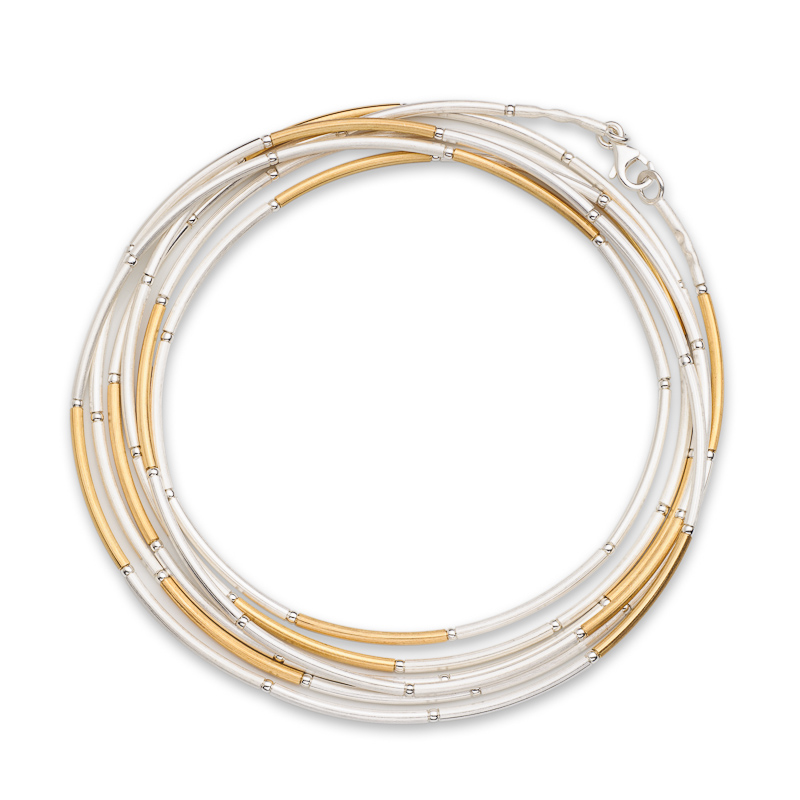 Naszyjnik wykonany ze srebra, z pozłacanymi elementami. Baaardzo długi, dzięki czemu można go nosić na różne sposoby i długości jako naszyjnik lub jako bransoletę!!! Długość naszyjnika 80 cm. Wykonany przez krakowskiego artystę plastyka. Do kompletu można dobrać śliczne kolczyki k69a.