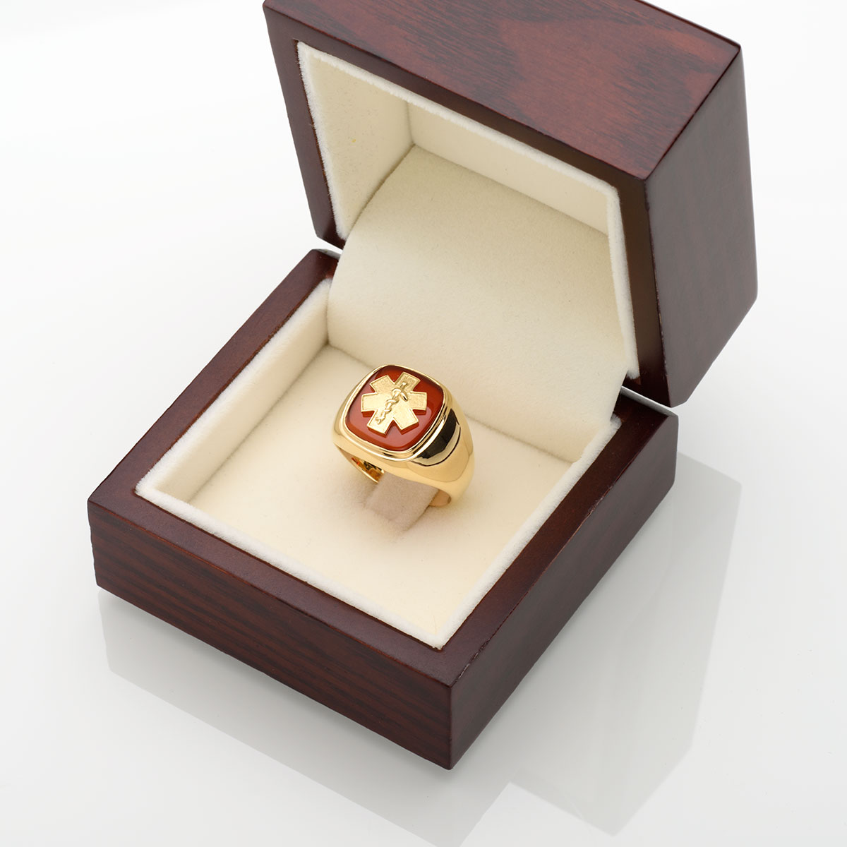 Złoty sygnet ze znakiem Gwiazdy Życia i laską Eskulapa - międzynarodowym symbolem ratownictwa medycznego. Sygnet wykonany jest z żółtego złota próba 585 , znak również wykonany ze złota osadzony jest na płytce z karneolu lub onyksu (do wybory w opcjach). Sygnet męski wykonany ręcznie przez najlepszych jubilerów z Krakowa.
