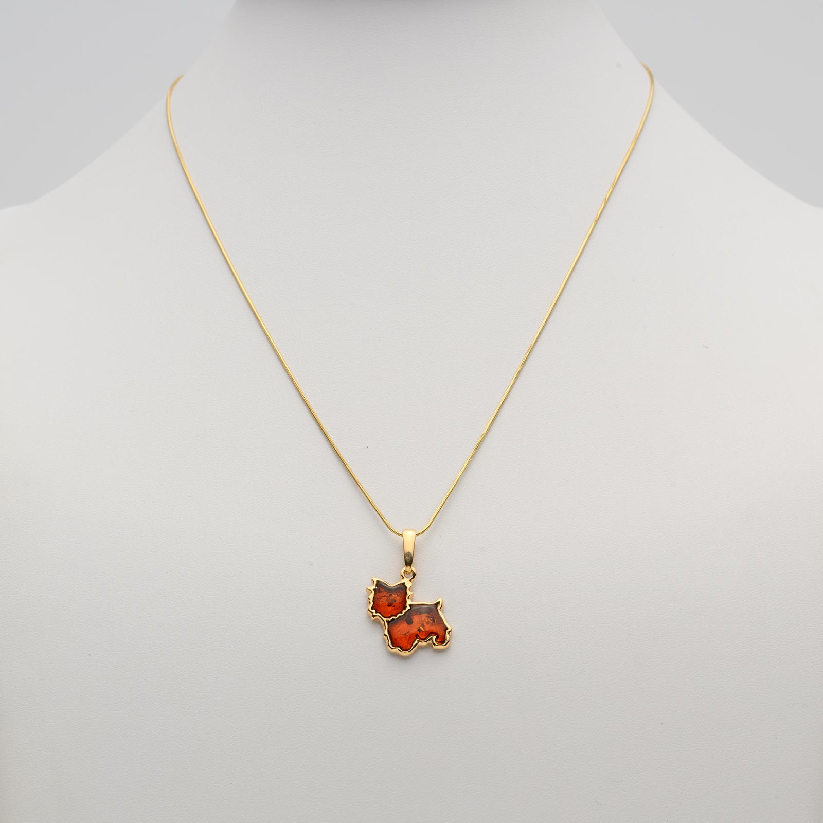 Uroczy Naszyjnik z Wisiorkiem Piesek York i Naturalnym Bursztynem oprawiony w srebro zlocone.