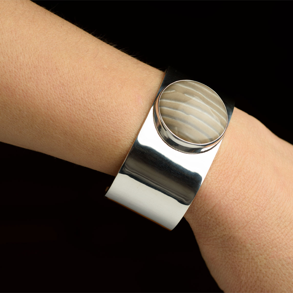 Duża, okazała i efektowna bransoletka wykonana ze srebra próby 925 zdobiona owalnym krzemieniem pasiastym - kamieniem optymizmu. Bransoletka ma kształt owalny o wymiarach (średnice): 60 x 45mm, można ją dopasować do ręki poprzez delikatne zgięcie lub rozgięcie. Szerokość bransolety 32mm. Kamień okrągły o średnicy 30mm. Waga całości: 46,00 g. Bransoletkę pakujemy gratisowo do ozdobnego, kartonowego pudełeczka. Pokazane na zdjęciu ekskluzywne, drewniane, lakierowane pudełko model_22 można dokupić w dziale "Pudełka jubilerskie".